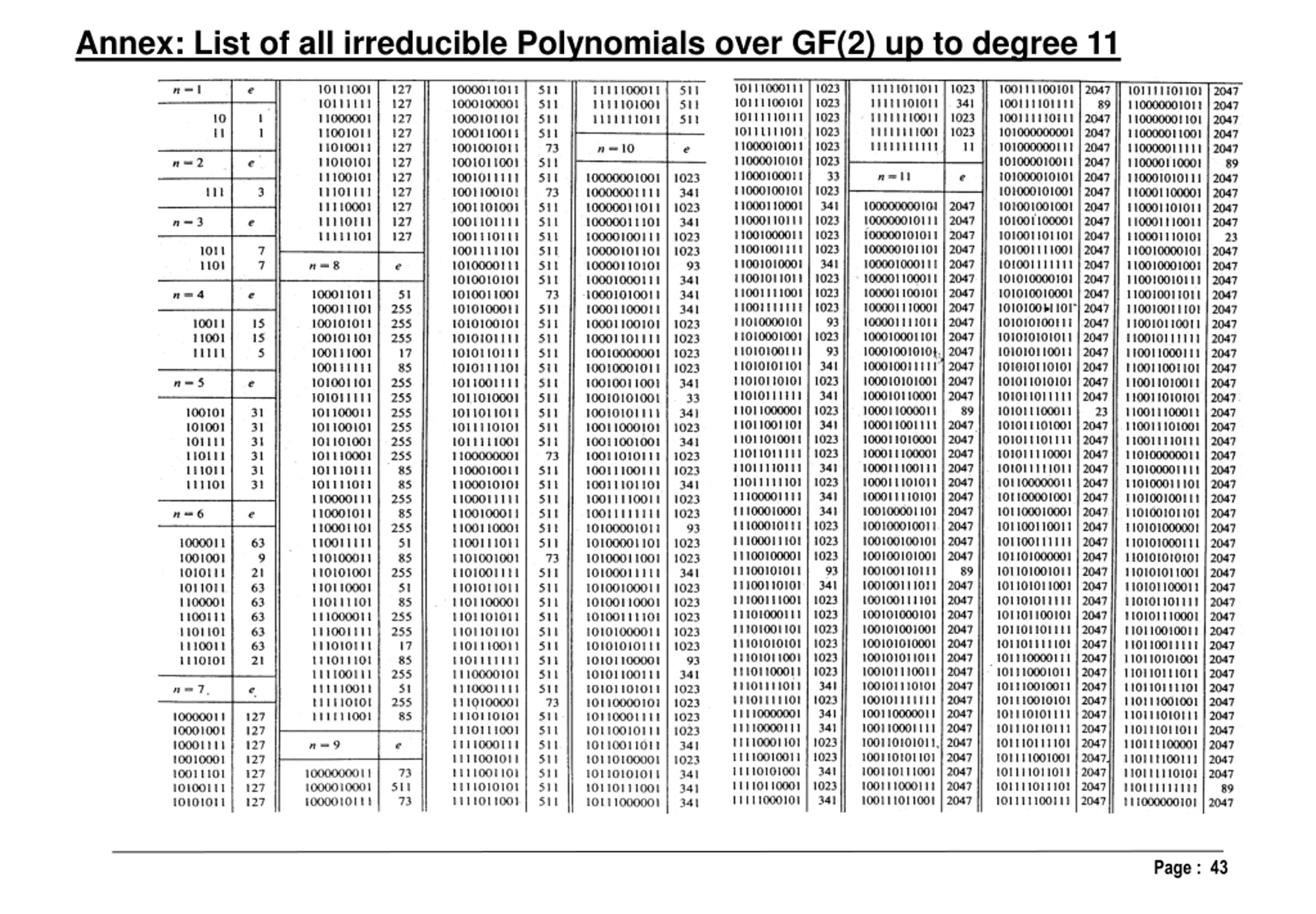Annex: List of all irreducible Polynomials over GF(2) up to degree 11 Page : 43
