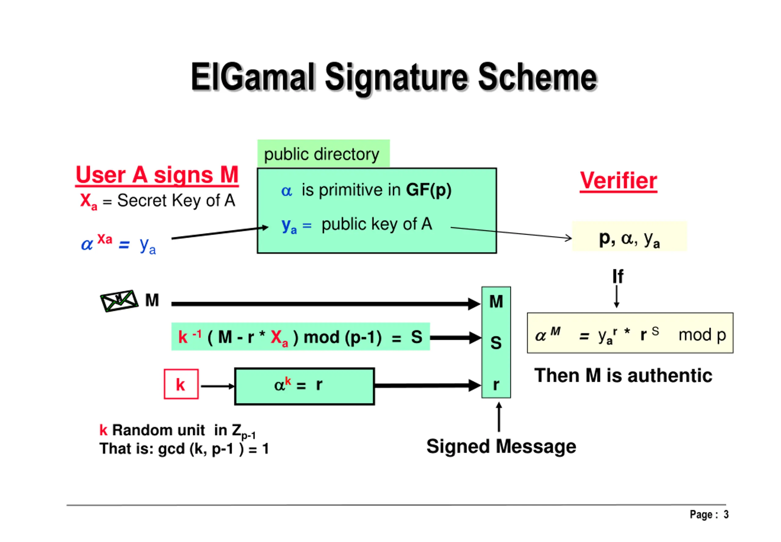 ElGamal Signature Scheme public directory User A signs M Verifier is primitive in GF(p) Xa= Secret Key of A ya= public key of A p, , ya Xa= ya If M M M = yar* r S mod p k-1( M - r * Xa) mod (p-1) = S S Then M is authentic k= r r k k Random unit in Zp-1 That is: gcd (k, p-1 ) = 1 Signed Message Page : 3