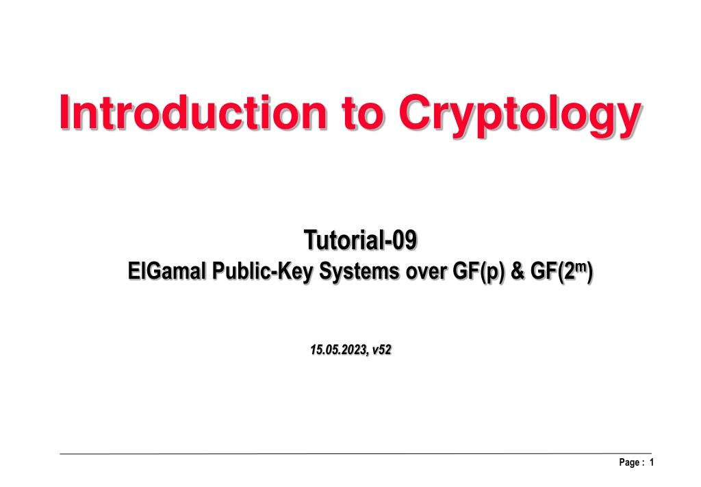 Introduction to Cryptology Tutorial-09 ElGamal Public-Key Systems over GF(p) & GF(2m) 15.05.2023, v52 Page : 1
