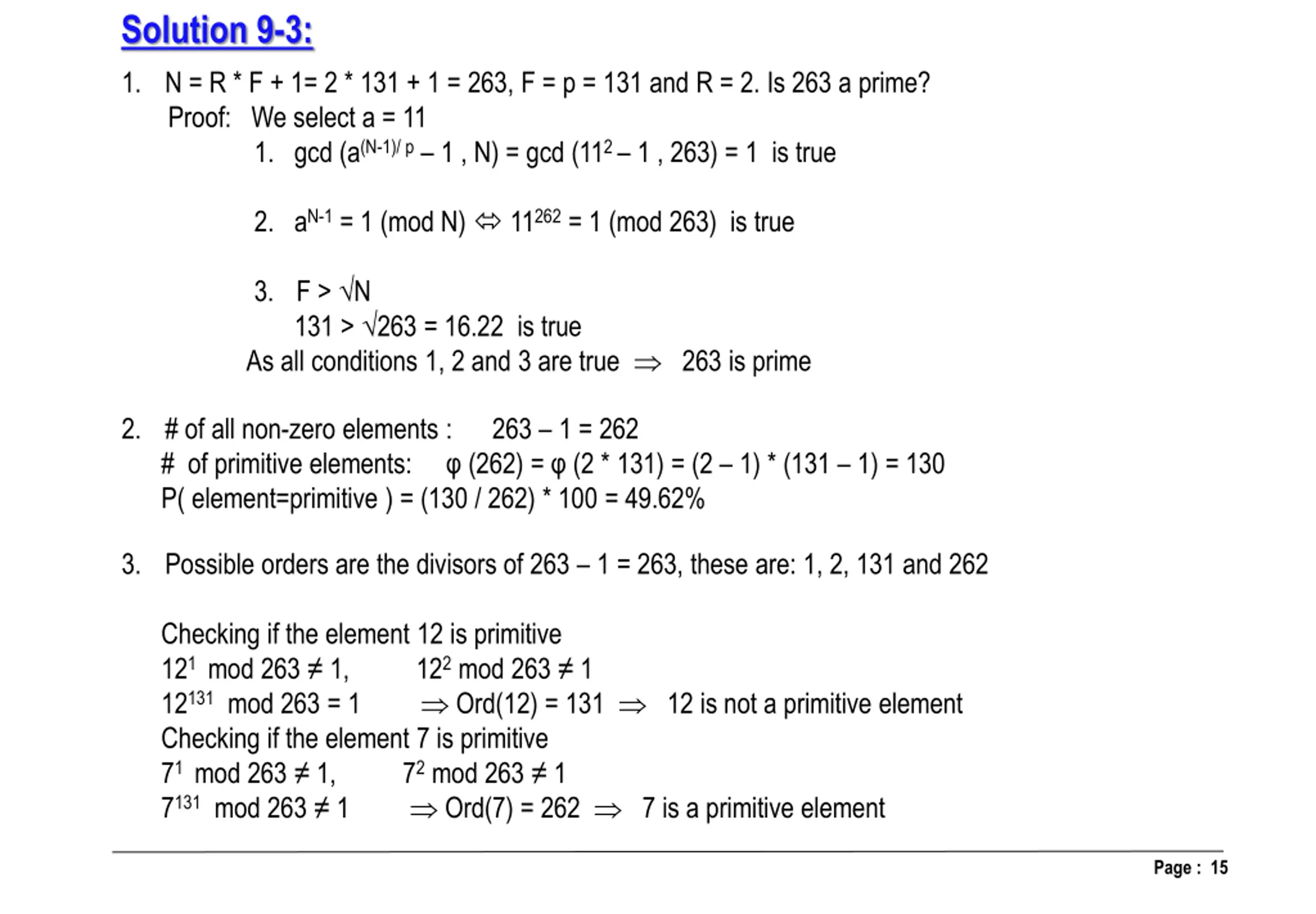 Solution 9-3: 1. N = R * F + 1= 2 * 131 + 1 = 263, F = p = 131 and R = 2. Is 263 a prime? Proof: We select a = 11 1. gcd (a(N-1)/ p 1 , N) = gcd (112 1 , 263) = 1 is true 2. aN-1= 1 (mod N) 11262= 1 (mod 263) is true 3. F > N 131 > 263 = 16.22 is true As all conditions 1, 2 and 3 are true 263 is prime 2. # of all non-zero elements : 263 1 = 262 # of primitive elements: (262) = (2 * 131) = (2 1) * (131 1) = 130 P( element=primitive ) = (130 / 262) * 100 = 49.62% 3. Possible orders are the divisors of 263 1 = 263, these are: 1, 2, 131 and 262 Checking if the element 12 is primitive 121 mod 263 1, 122mod 263 1 12131mod 263 = 1 Ord(12) = 131 12 is not a primitive element Checking if the element 7 is primitive 71 mod 263 1, 72mod 263 1 7131mod 263 1 Ord(7) = 262 7 is a primitive element Page : 15