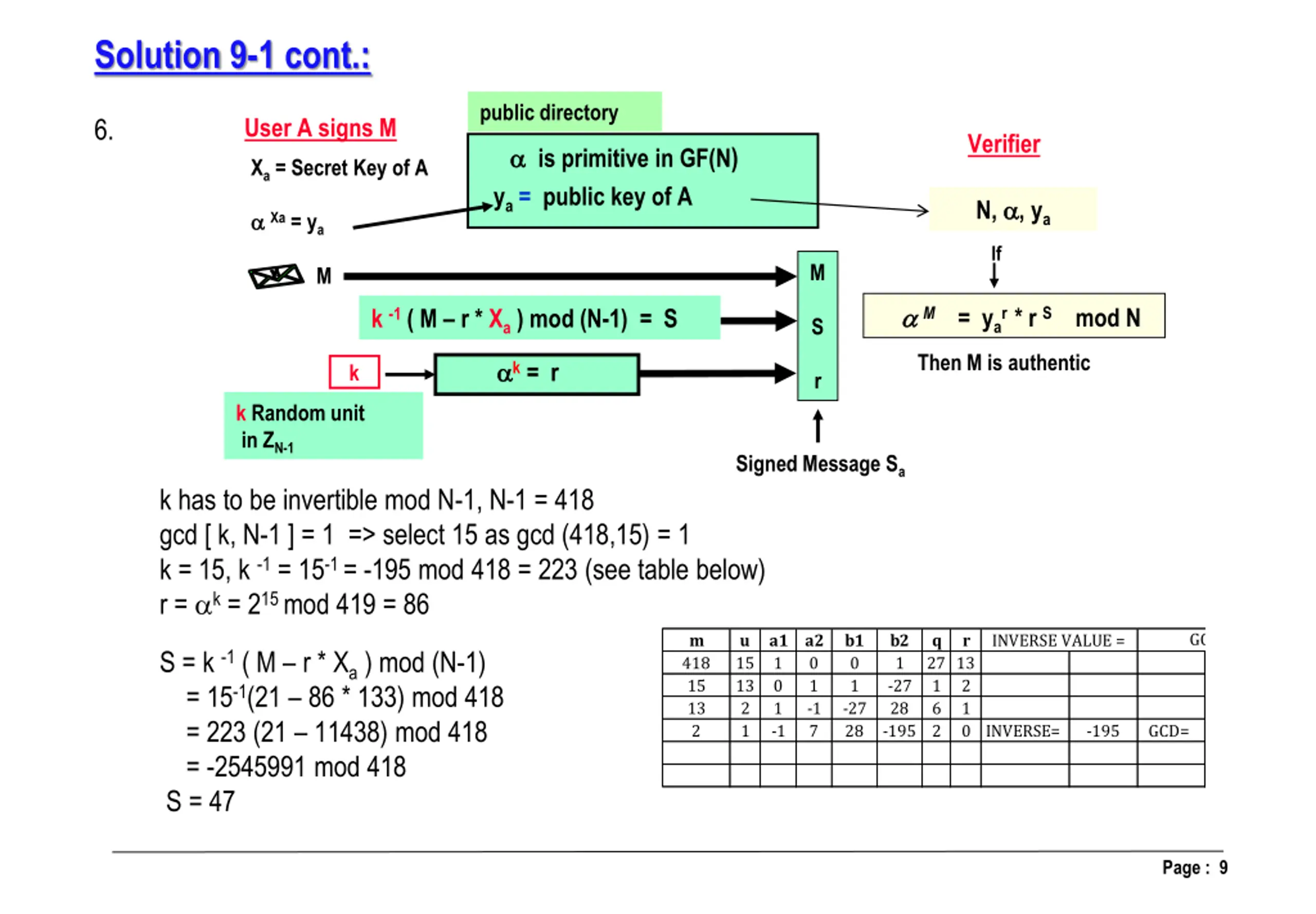 Solution 9-1 cont.: public directory 6. User A signs M Verifier is primitive in GF(N) ya= public key of A Xa= Secret Key of A N, , ya Xa= ya If M M M = yar* r S mod N k-1( M r * Xa) mod (N-1) = S S Then M is authentic k= r k r k Random unit in ZN-1 Signed Message Sa k has to be invertible mod N-1, N-1 = 418 gcd [ k, N-1 ] = 1 => select 15 as gcd (418,15) = 1 k = 15, k -1= 15-1 = -195 mod 418 = 223 (see table below) r = k= 215 mod 419 = 86 GCD m 418 15 13 2 u 15 13 2 1 a1 1 0 1 -1 a2 0 1 -1 7 b1 0 1 -27 28 b2 1 -27 28 -195 q r INVERSE VALUE = S = k -1( M r * Xa) mod (N-1) = 15-1(21 86 * 133) mod 418 = 223 (21 11438) mod 418 = -2545991 mod 418 S = 47 27 13 1 6 2 2 1 0 INVERSE= -195 GCD= Page : 9