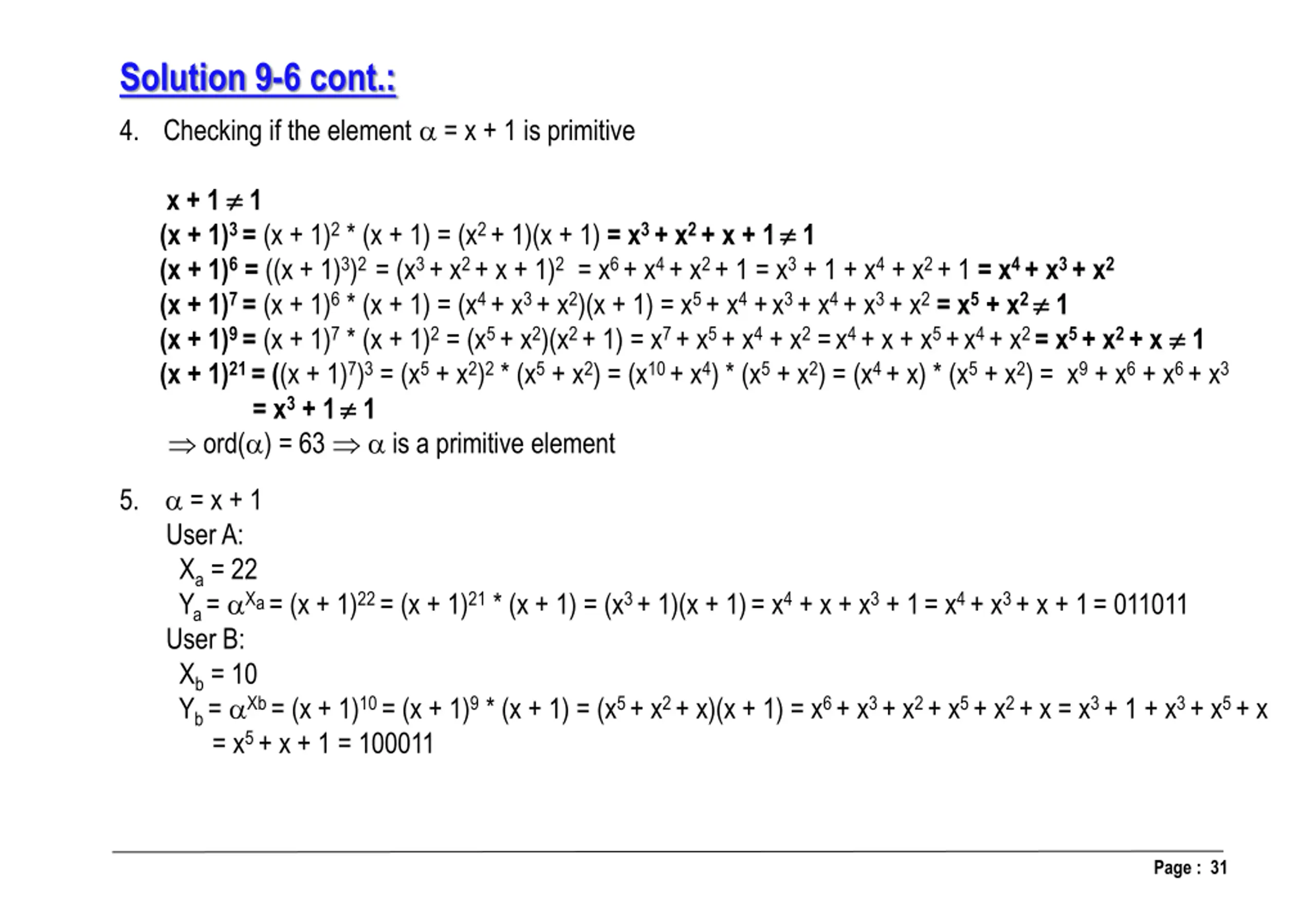 Solution 9-6 cont.: 4. Checking if the element = x + 1 is primitive x + 1 1 (x + 1)3 = (x + 1)2* (x + 1) = (x2 + 1)(x + 1) = x3 + x2 + x + 1 1 (x + 1)6= ((x + 1)3)2 = (x3 + x2 + x + 1)2= x6 + x4 + x2 + 1 = x3+ 1 + x4+ x2 + 1 = x4 + x3 + x2 (x + 1)7 = (x + 1)6* (x + 1) = (x4 + x3 + x2)(x + 1) = x5 + x4+x3 + x4 + x3 + x2= x5+ x2 1 (x + 1)9 = (x + 1)7* (x + 1)2= (x5 + x2)(x2 + 1) = x7 + x5 + x4+ x2=x4 + x + x5 +x4 + x2 = x5 + x2 + x 1 (x + 1)21 = ((x + 1)7)3= (x5+ x2)2* (x5+ x2) = (x10 + x4) * (x5+ x2) = (x4 + x) * (x5+ x2) = x9+ x6+ x6 + x3 = x3+ 1 1 ord( ) = 63 is a primitive element 5. = x + 1 User A: Xa = 22 Ya= Xa= (x + 1)22 = (x + 1)21* (x + 1) = (x3 + 1)(x + 1)= x4+ x + x3+ 1= x4 + x3 + x + 1= 011011 User B: Xb = 10 Yb= Xb= (x + 1)10 = (x + 1)9* (x + 1) = (x5 + x2 + x)(x + 1) = x6 + x3 + x2 + x5 + x2 + x = x3 + 1 + x3 + x5 + x = x5 + x + 1 = 100011 Page : 31