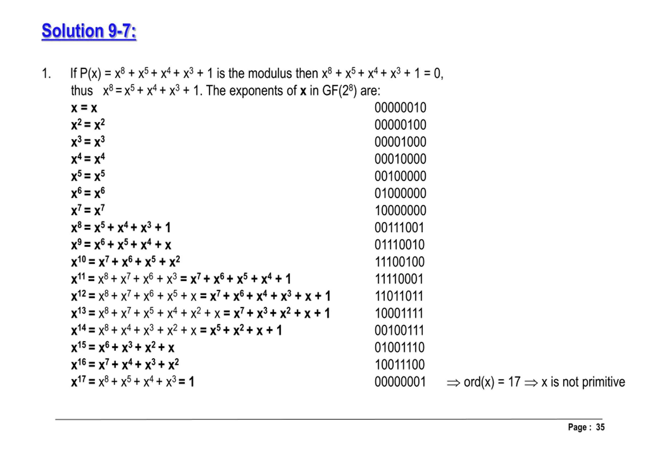 Solution 9-7: 1. If P(x) = x8+ x5 + x4 + x3+ 1 is the modulus then x8+ x5 + x4 + x3+ 1 = 0, thus x8 =x5 + x4 + x3+ 1. The exponents of x in GF(28) are: x = x x2 = x2 x3 = x3 x4 = x4 x5 = x5 x6 = x6 x7 = x7 x8 = x5 + x4 + x3+ 1 x9 = x6 + x5 + x4+ x x10 = x7 + x6 + x5+ x2 x11 = x8 + x7 + x6+ x3= x7 + x6 + x5+ x4+ 1 x12 = x8 + x7 + x6+ x5+ x = x7 + x6 + x4+ x3+ x + 1 x13 = x8 + x7 + x5+ x4+ x2+ x = x7 + x3 + x2+ x + 1 x14 = x8 + x4 + x3+ x2+ x = x5 + x2 + x + 1 x15 = x6 + x3 + x2 + x x16 = x7 + x4 + x3 + x2 x17 = x8 + x5 + x4 + x3 = 1 00000010 00000100 00001000 00010000 00100000 01000000 10000000 00111001 01110010 11100100 11110001 11011011 10001111 00100111 01001110 10011100 00000001 ord(x) = 17 x is not primitive Page : 35