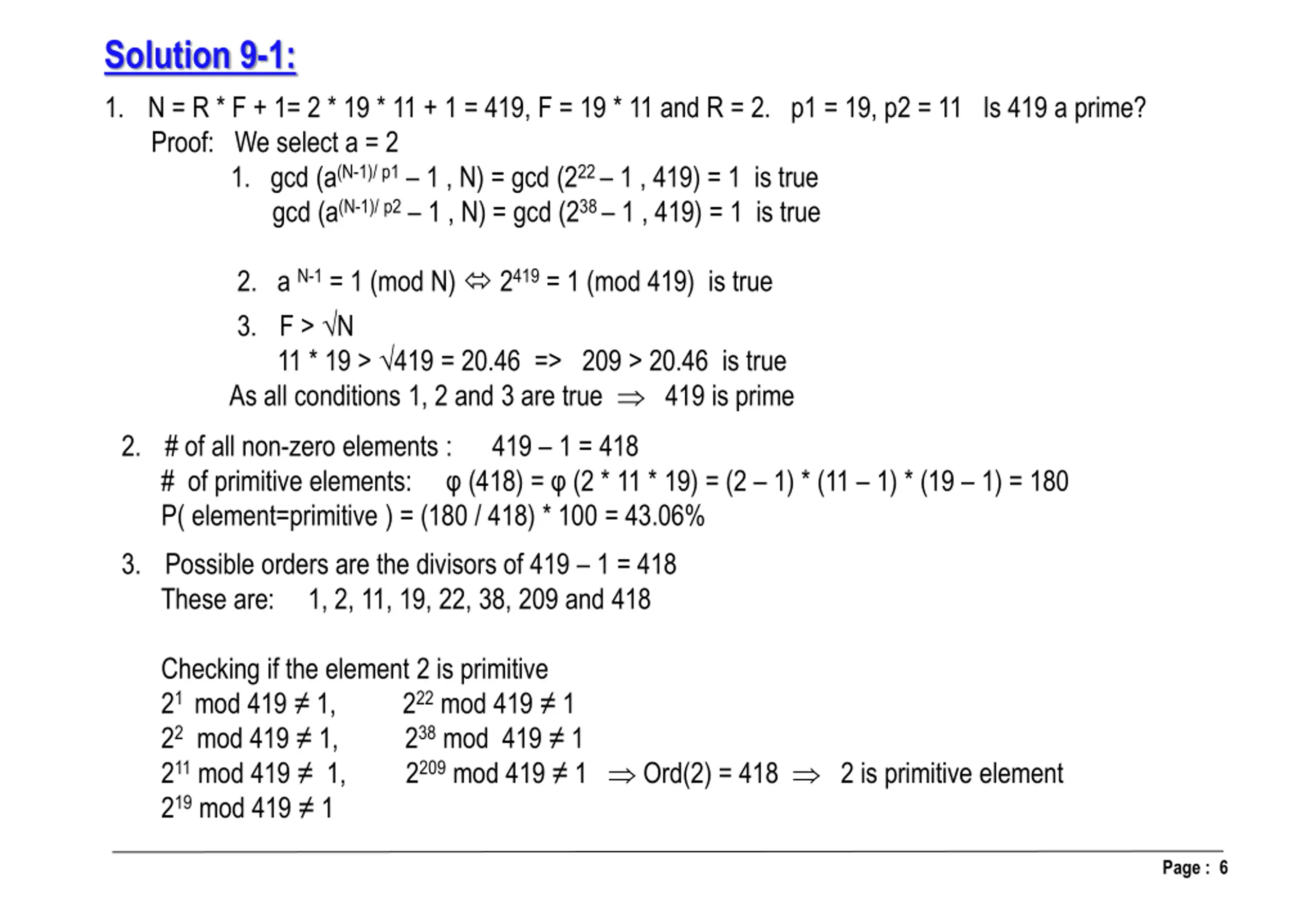 Solution 9-1: 1. N = R * F + 1= 2 * 19 * 11 + 1 = 419, F = 19 * 11 and R = 2. p1 = 19, p2 = 11 Is 419 a prime? Proof: We select a = 2 1. gcd (a(N-1)/ p1 1 , N) = gcd (222 1 , 419) = 1 is true gcd (a(N-1)/ p2 1 , N) = gcd (238 1 , 419) = 1 is true 2. a N-1= 1 (mod N) 2419= 1 (mod 419) is true 3. F > N 11 * 19 > 419 = 20.46 => 209 > 20.46 is true As all conditions 1, 2 and 3 are true 419 is prime 2. # of all non-zero elements : 419 1 = 418 # of primitive elements: (418) = (2 * 11 * 19) = (2 1) * (11 1) * (19 1) = 180 P( element=primitive ) = (180 / 418) * 100 = 43.06% 3. Possible orders are the divisors of 419 1 = 418 These are: 1, 2, 11, 19, 22, 38, 209 and 418 Checking if the element 2 is primitive 21 mod 419 1, 222mod 419 1 22mod 419 1, 238mod 419 1 211mod 419 1, 2209mod 419 1 Ord(2) = 418 2 is primitive element 219mod 419 1 Page : 6