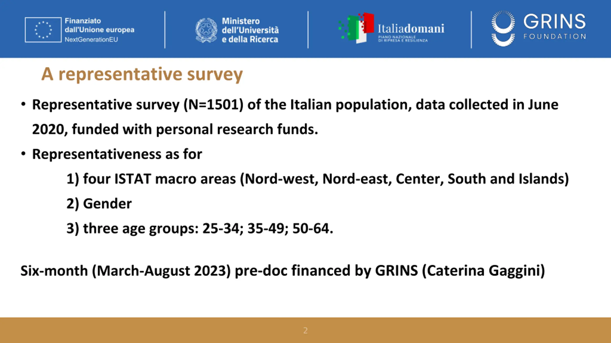 A representative survey Representative survey (N=1501) of the Italian population, data collected in June 2020, funded with personal research funds. Representativeness as for 1) four ISTAT macro areas (Nord-west, Nord-east, Center, South and Islands) 2) Gender 3) three age groups: 25-34; 35-49; 50-64. Six-month (March-August 2023) pre-doc financed by GRINS (Caterina Gaggini)