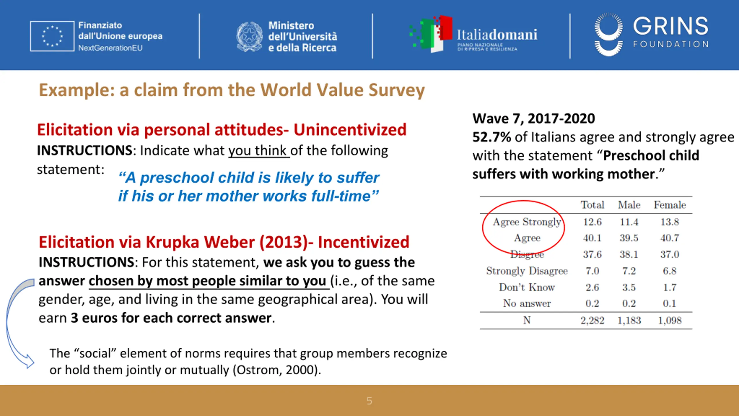 Example: a claim from the World Value Survey Wave 7, 2017-2020 52.7% of Italians agree and strongly agree with the statement Preschool child suffers with working mother. Elicitation via personal attitudes- Unincentivized INSTRUCTIONS: Indicate what you think of the following statement: A preschool child is likely to suffer if his or her mother works full-time Elicitation via Krupka Weber (2013)- Incentivized INSTRUCTIONS: For this statement, we ask you to guess the answer chosen by most people similar to you (i.e., of the same gender, age, and living in the same geographical area). You will earn 3 euros for each correct answer. The social element of norms requires that group members recognize or hold them jointly or mutually (Ostrom, 2000).