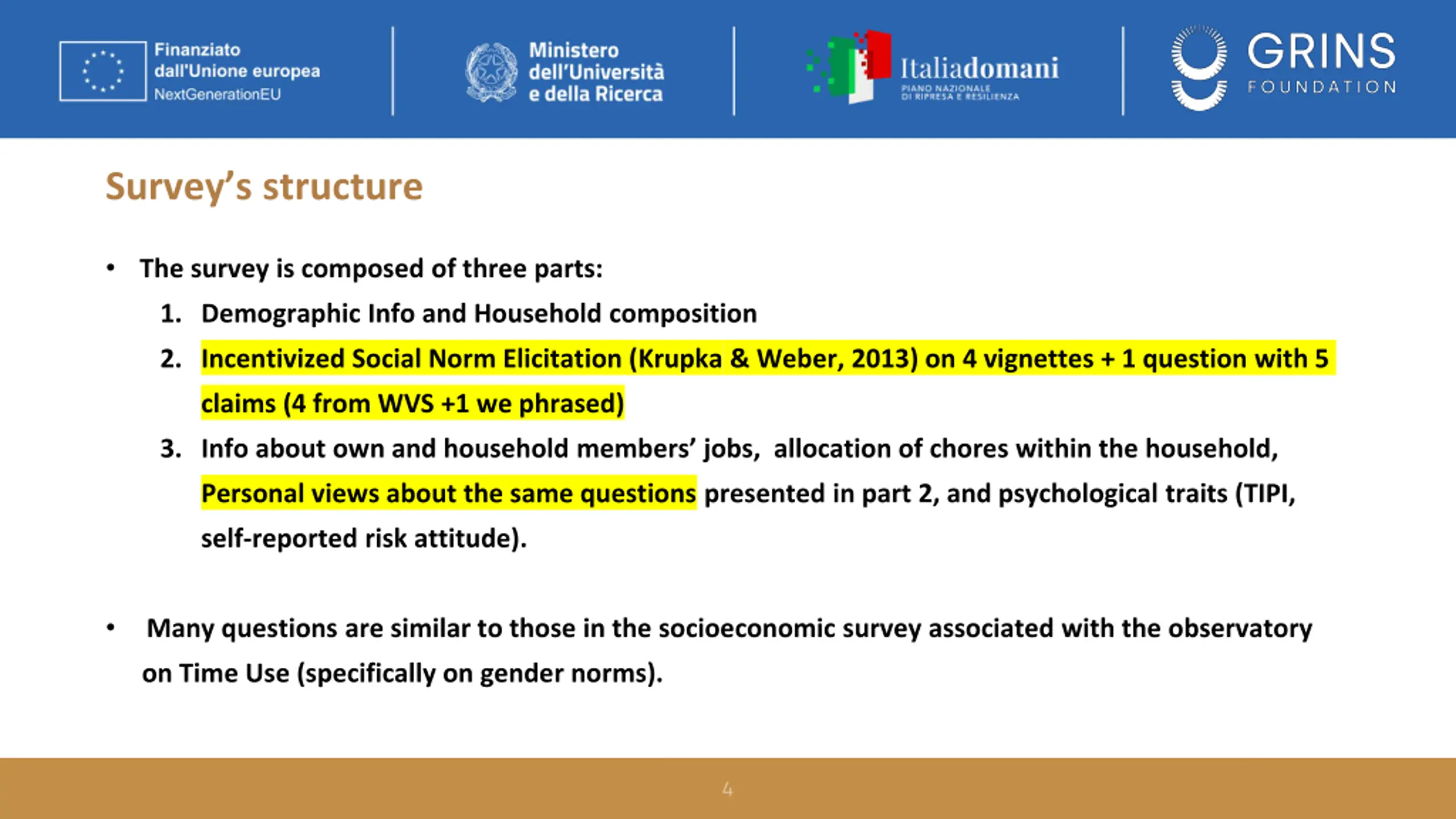 Surveys structure The survey is composed of three parts: 1. Demographic Info and Household composition 2. Incentivized Social Norm Elicitation (Krupka & Weber, 2013) on 4 vignettes + 1 question with 5 claims (4 from WVS +1 we phrased) 3. Info about own and household members jobs, allocation of chores within the household, Personal views about the same questions presented in part 2, and psychological traits (TIPI, self-reported risk attitude). Many questions are similar to those in the socioeconomic survey associated with the observatory on Time Use (specifically on gender norms).
