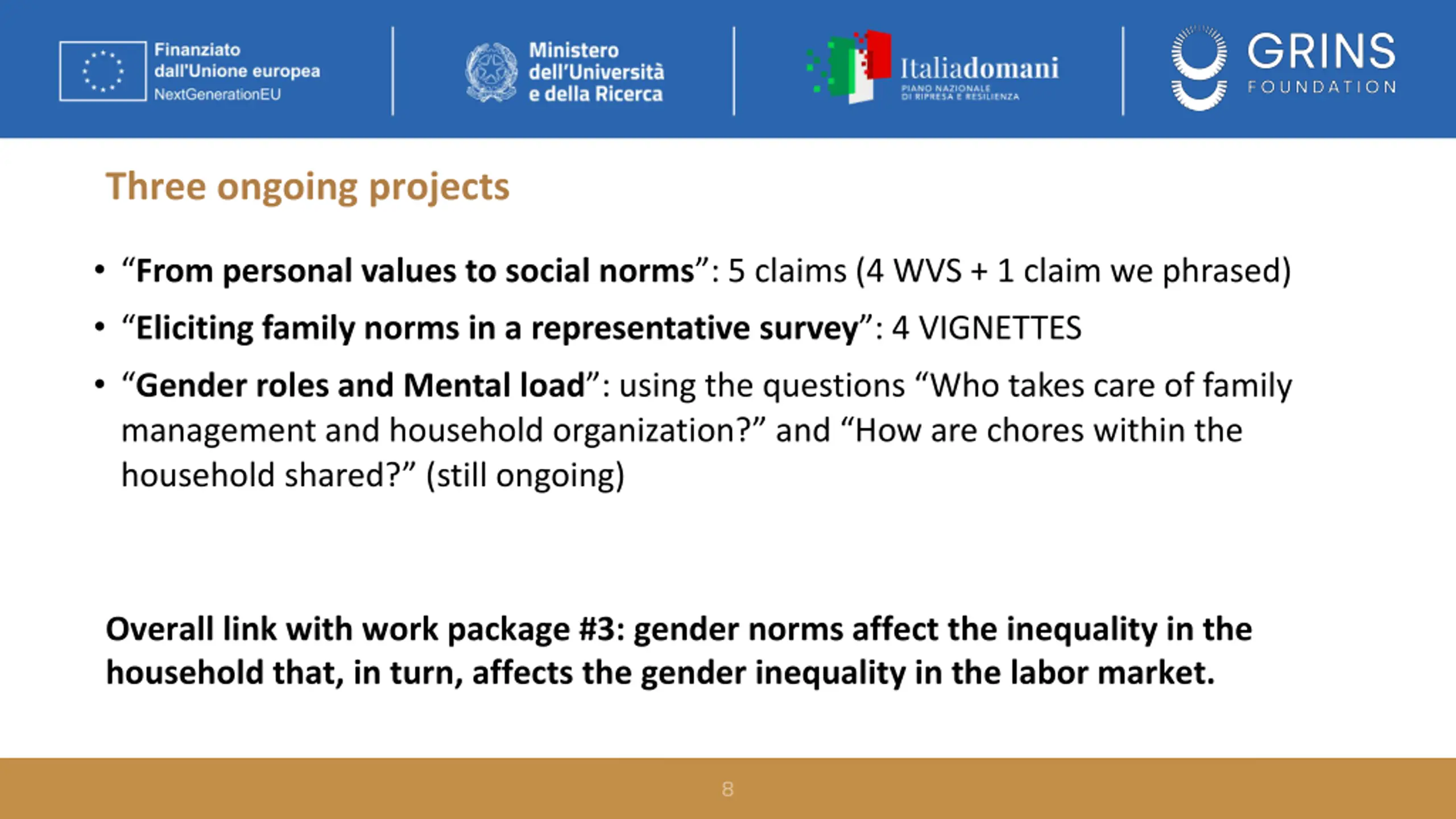 Three ongoing projects From personal values to social norms : 5 claims (4 WVS + 1 claim we phrased) Eliciting family norms in a representative survey : 4 VIGNETTES Gender roles and Mental load : using the questions Who takes care of family management and household organization? and How are chores within the household shared? (still ongoing) Overall link with work package #3: gender norms affect the inequality in the household that, in turn, affects the gender inequality in the labor market.