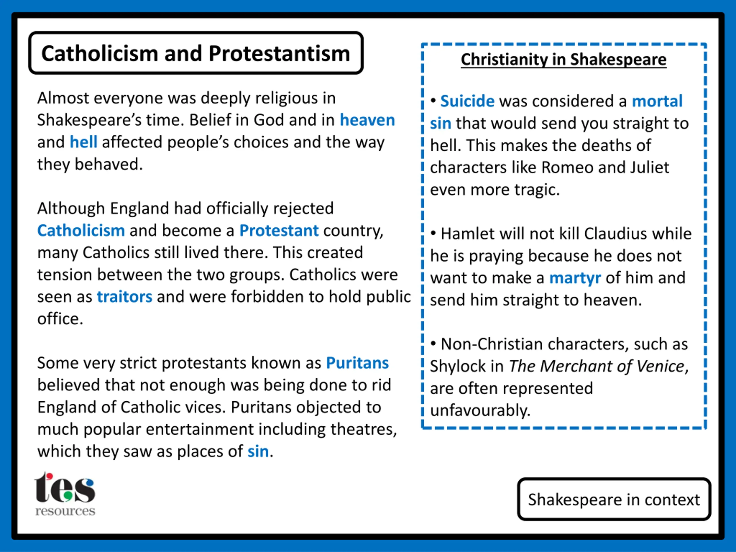 Catholicism and Protestantism Christianity in Shakespeare Almost everyone was deeply religious in Shakespeare s time. Belief in God and in heaven and hellaffected people s choices and the way they behaved. Suicide was considered a mortal sin that would send you straight to hell. This makes the deaths of characters like Romeo and Juliet even more tragic. Although England had officially rejected Catholicism and become a Protestant country, many Catholics still lived there. This created tension between the two groups. Catholics were seen as traitors and were forbidden to hold public office. Hamlet will not kill Claudius while he is praying because he does not want to make a martyr of him and send him straight to heaven. Non-Christian characters, such as Shylock in The Merchant of Venice, are often represented unfavourably. Some very strict protestants known as Puritans believed that not enough was being done to rid England of Catholic vices. Puritans objected to much popular entertainment including theatres, which they saw as places of sin. Shakespeare in context