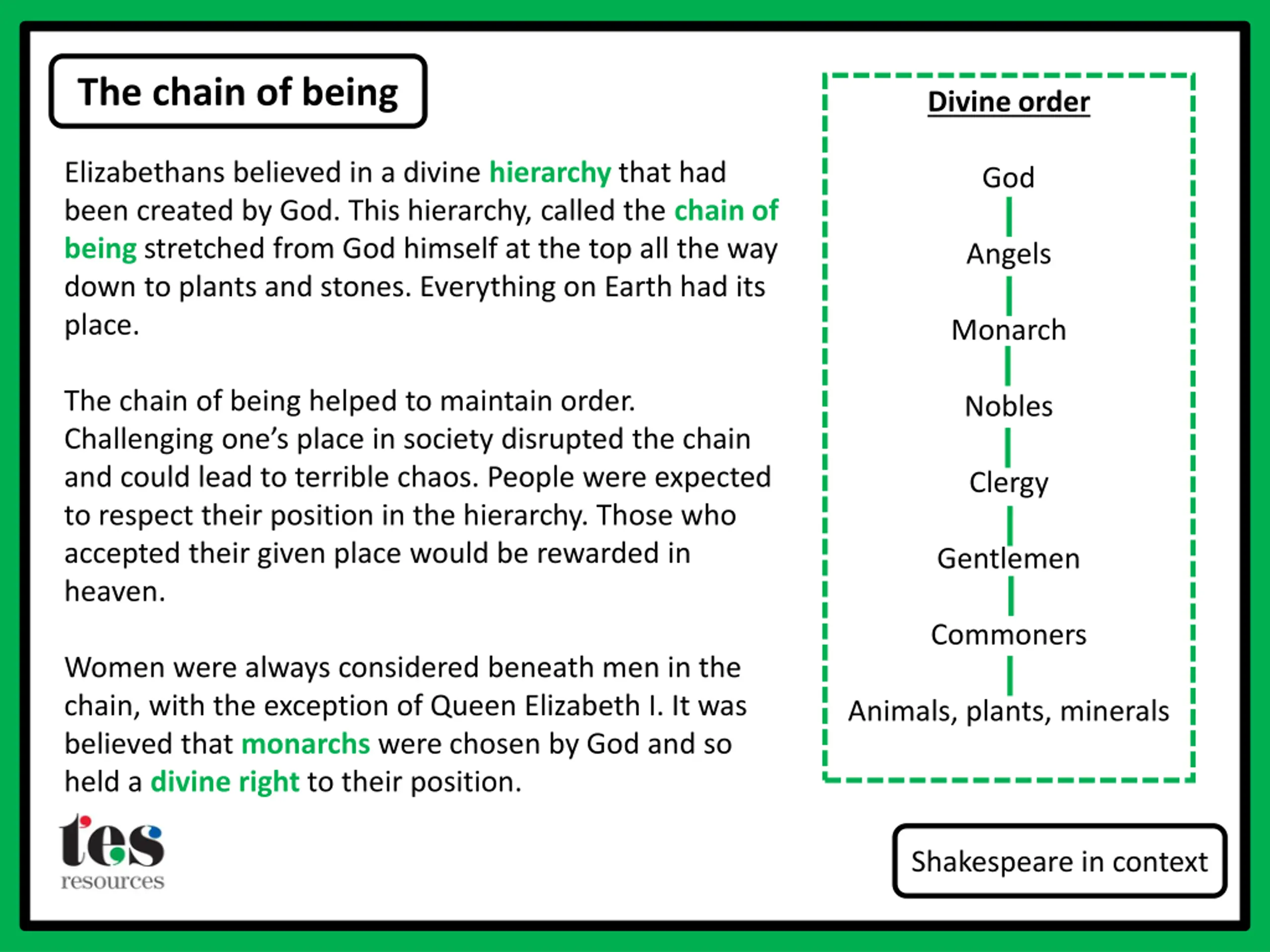 The chain of being Divine order Elizabethans believed in a divine hierarchy that had been created by God. This hierarchy, called the chain of being stretched from God himself at the top all the way down to plants and stones. Everything on Earth had its place. God Angels Monarch The chain of being helped to maintain order. Challenging one s place in society disrupted the chain and could lead to terrible chaos. People were expected to respect their position in the hierarchy. Those who accepted their given place would be rewarded in heaven. Nobles Clergy Gentlemen Commoners Women were always considered beneath men in the chain, with the exception of Queen Elizabeth I. It was believed that monarchs were chosen by God and so held a divine right to their position. Animals, plants, minerals Shakespeare in context
