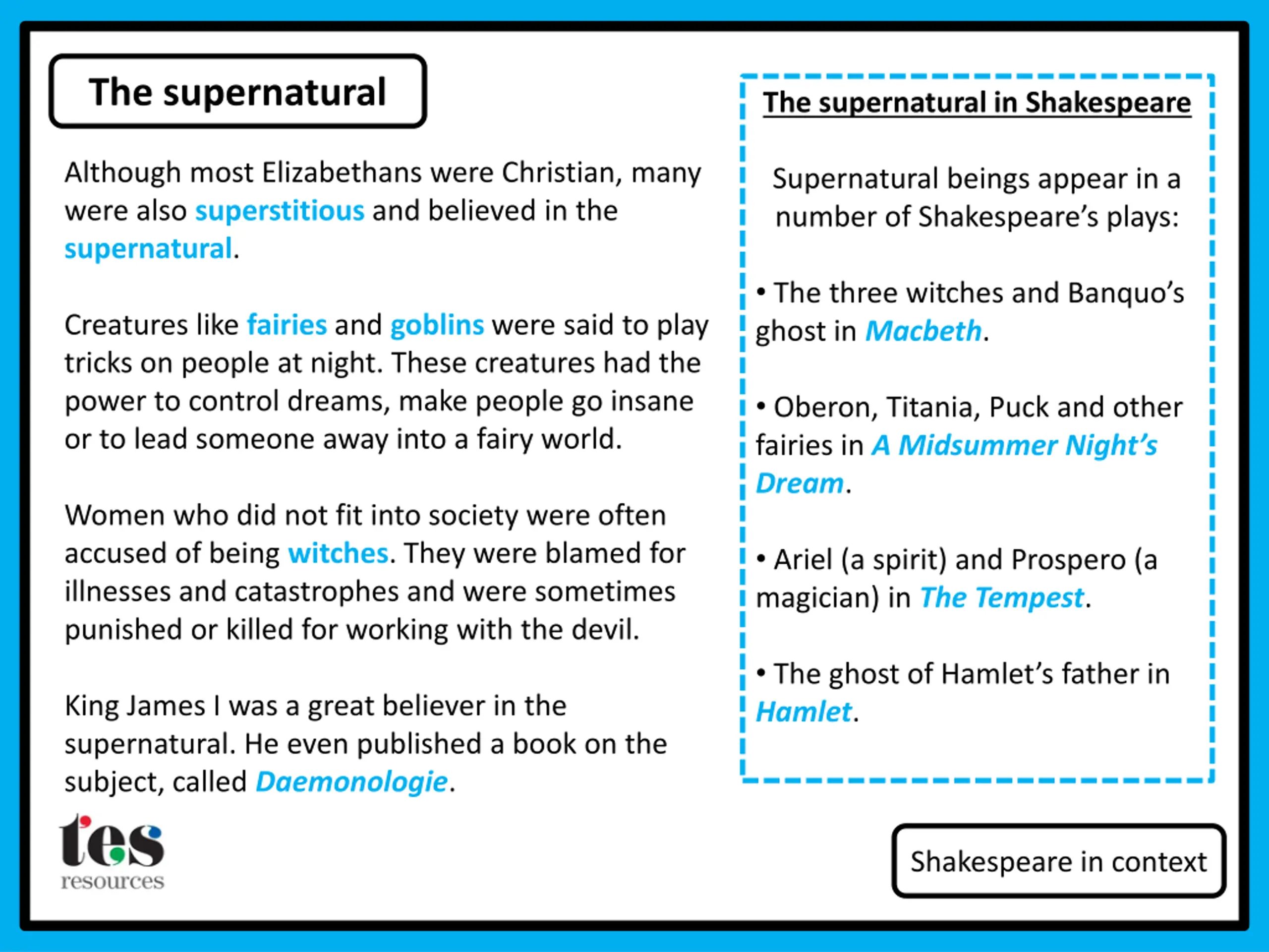 The supernatural The supernatural in Shakespeare Although most Elizabethans were Christian, many were also superstitious and believed in the supernatural. Supernatural beings appear in a number of Shakespeare s plays: Thethree witches and Banquo s ghost in Macbeth. Creatures like fairies and goblins were said to play tricks on people at night. These creatures had the power to control dreams, make people go insane or to lead someone away into a fairy world. Oberon, Titania, Puck and other fairies in A Midsummer Night s Dream. Women who did not fit into society were often accused of being witches. They were blamed for illnesses and catastrophes and were sometimes punished or killed for working with the devil. Ariel (a spirit) and Prospero (a magician) in The Tempest. The ghost of Hamlet s father in Hamlet. King James I was a great believer in the supernatural. He even published a book on the subject, called Daemonologie. Shakespeare in context