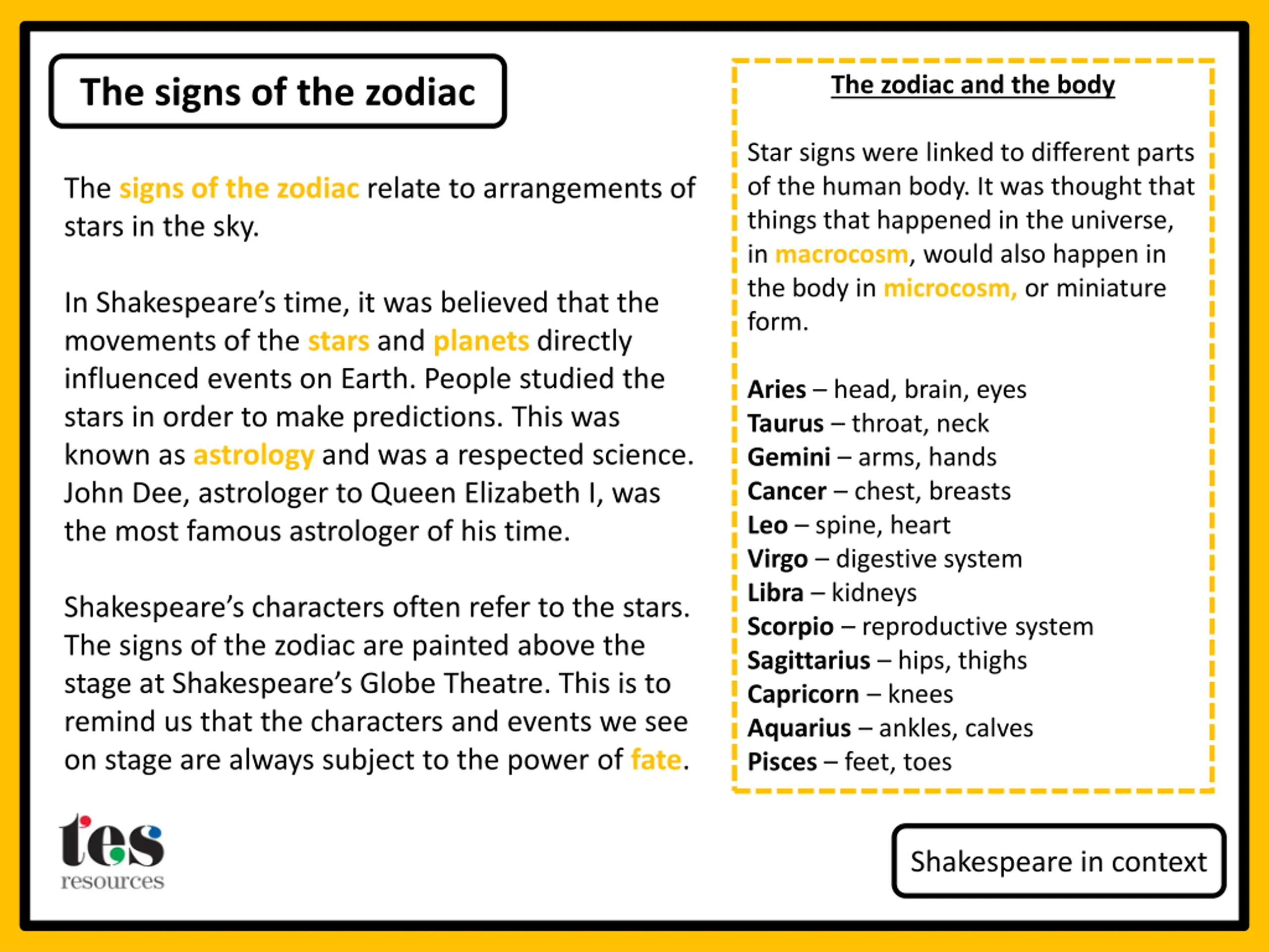 The zodiac and the body The signs of the zodiac Star signs were linked to different parts of the human body. It was thought that things that happened in the universe, in macrocosm, would also happen in the body in microcosm, or miniature form. The signs of the zodiac relate to arrangements of stars in the sky. In Shakespeare s time, it was believed that the movements of the stars and planets directly influenced events on Earth. People studied the stars in order to make predictions. This was known as astrology and was a respected science. John Dee, astrologer to Queen Elizabeth I, was the most famous astrologer of his time. Aries head, brain, eyes Taurus throat, neck Gemini arms, hands Cancer chest, breasts Leo spine, heart Virgo digestive system Libra kidneys Scorpio reproductive system Sagittarius hips, thighs Capricorn knees Aquarius ankles, calves Pisces feet, toes Shakespeare s characters often refer to the stars. The signs of the zodiac are painted above the stage at Shakespeare s Globe Theatre. This is to remind us that the characters and events we see on stage are always subject to the power of fate. Shakespeare in context