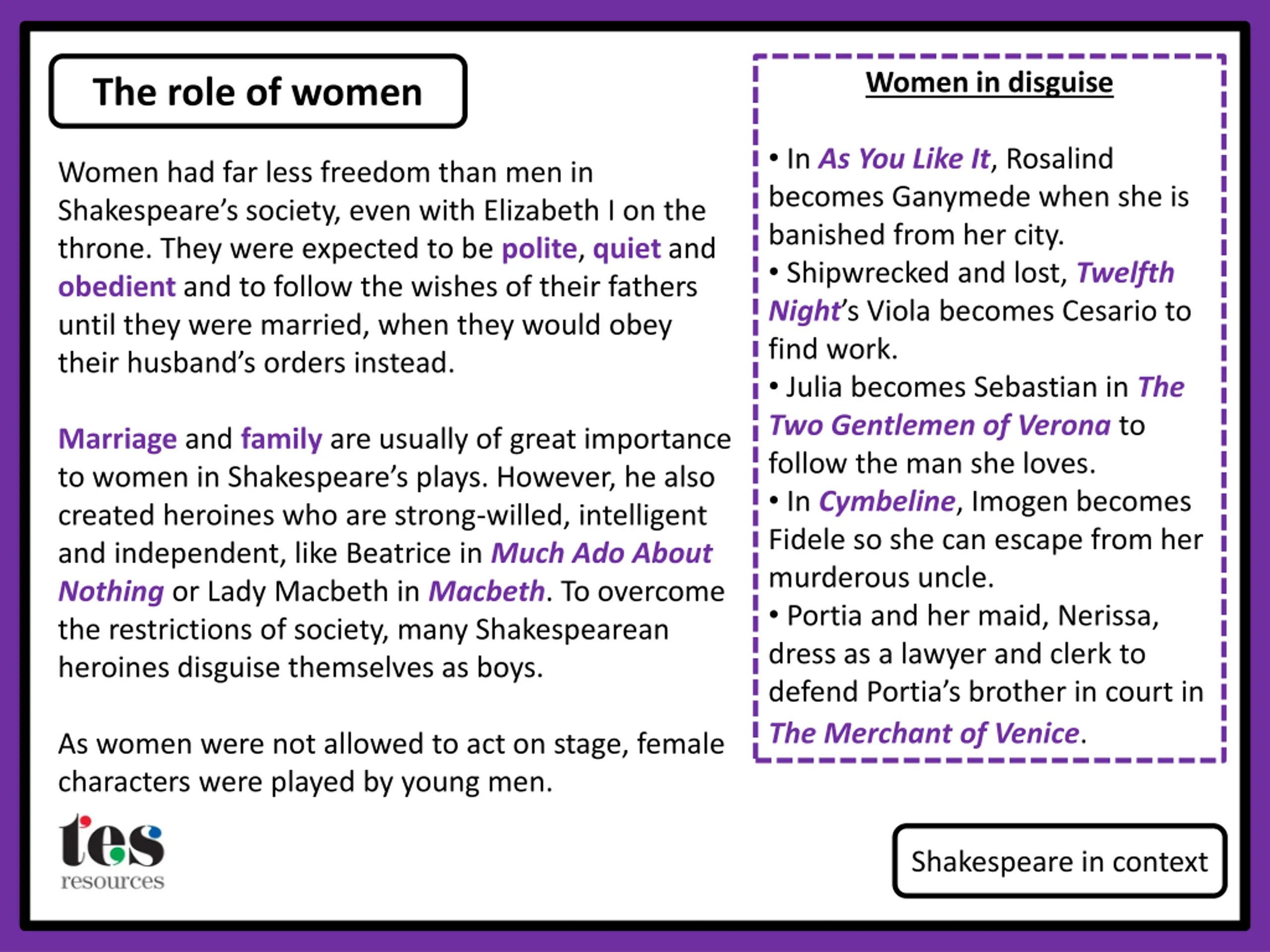 Women in disguise The role of women In As You Like It,Rosalind becomes Ganymede when she is banished from her city. Shipwrecked and lost, Twelfth Night sViola becomes Cesario to find work. Julia becomes Sebastian in The Two Gentlemen of Veronato follow the man she loves. In Cymbeline, Imogen becomes Fidele so she can escape from her murderous uncle. Portia and her maid, Nerissa, dress as a lawyer and clerk to defend Portia s brother in court in The Merchant of Venice. Women had far less freedom than men in Shakespeare s society, even with Elizabeth I on the throne. They were expected to be polite, quiet and obedient and to follow the wishes of their fathers until they were married, when they would obey their husband s orders instead. Marriage and family are usually of great importance to women in Shakespeare s plays. However, he also created heroines who are strong-willed, intelligent and independent, like Beatrice in Much Ado About Nothing or Lady Macbeth in Macbeth. To overcome the restrictions of society, many Shakespearean heroines disguise themselves as boys. As women were not allowed to act on stage, female characters were played by young men. Shakespeare in context