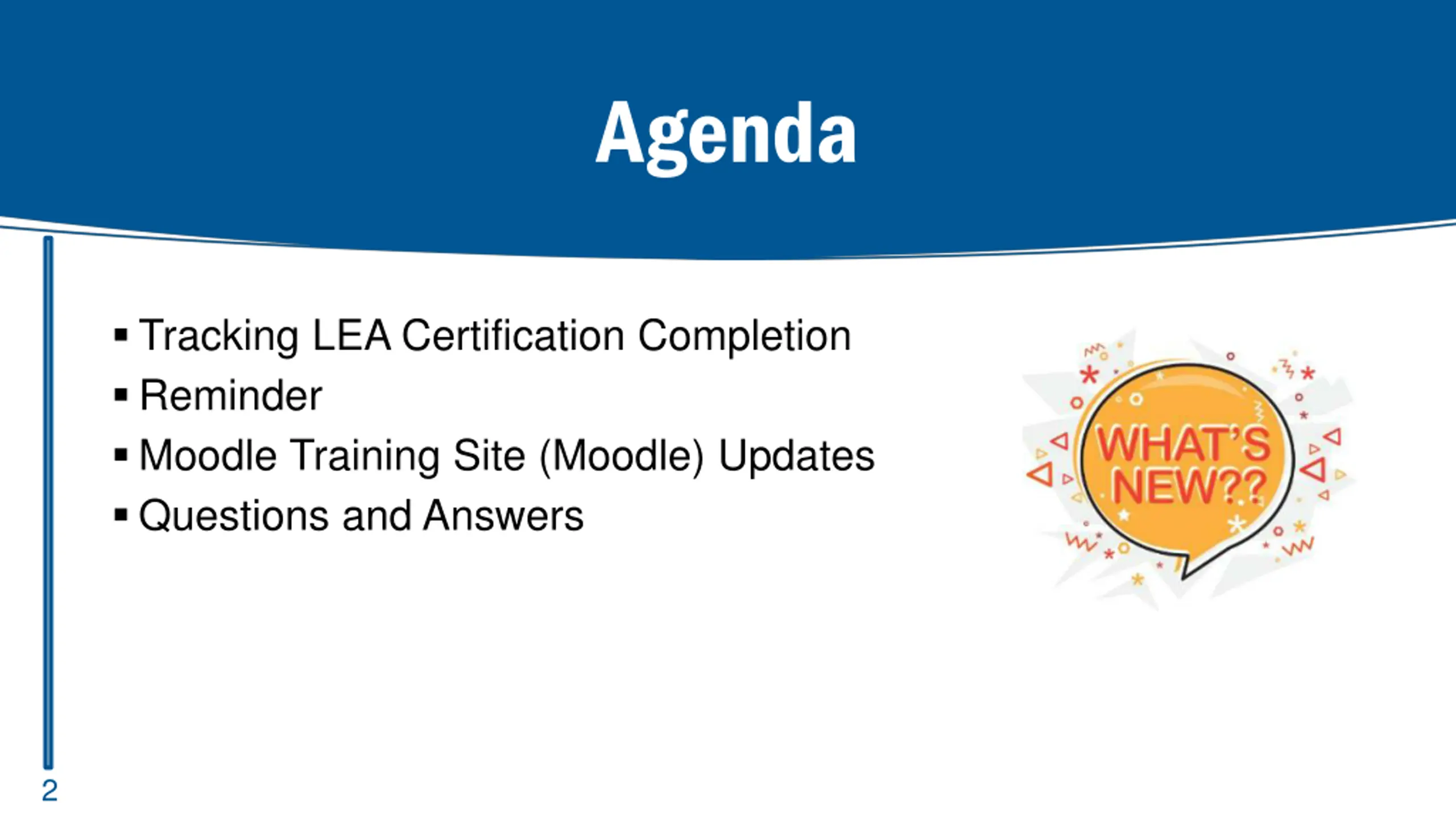 Agenda Tracking LEA Certification Completion Reminder Moodle Training Site (Moodle) Updates Questions and Answers 2