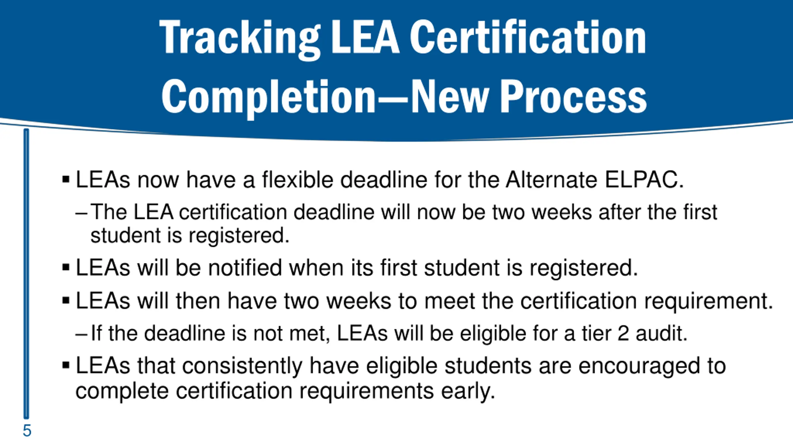 Tracking LEA Certification Completion Remains the Same LEA coordinators or their staff still need to meet both the Initial Alternate ELPAC and the Summative Alternate ELPAC LEA certification requirements. The Initial Alternate ELPAC LEA Coordinators course or the verification process on the Administration and Scoring Training website must be completed annually. The Summative Alternate ELPAC LEA Coordinators Certification course must be completed annually. 3