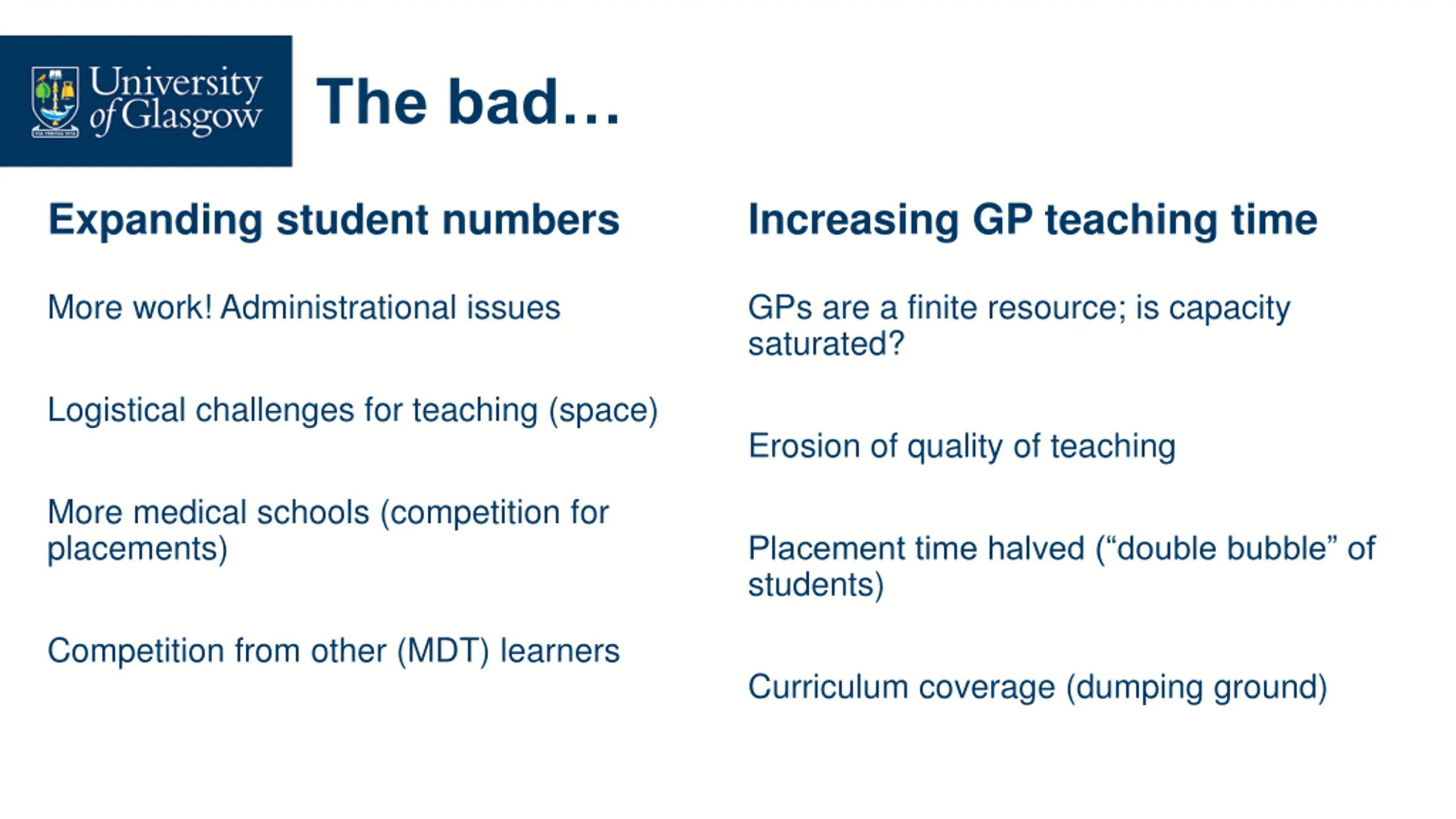 The bad Expanding student numbers Increasing GP teaching time More work! Administrational issues GPs are a finite resource; is capacity saturated? Logistical challenges for teaching (space) Erosion of quality of teaching More medical schools (competition for placements) Placement time halved ( double bubble of students) Competition from other (MDT) learners Curriculum coverage (dumping ground)