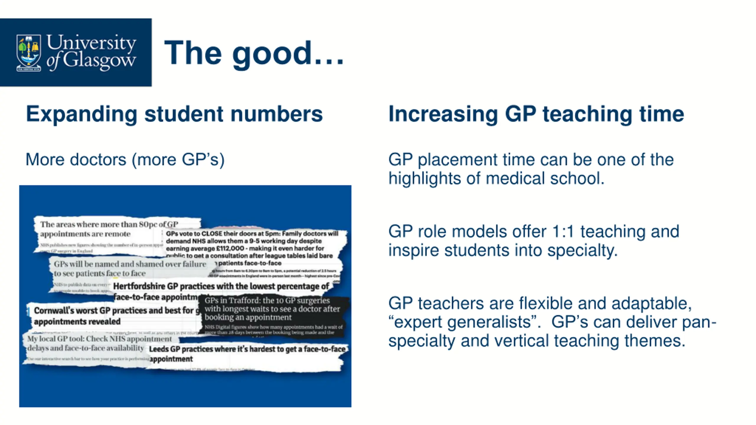 The good Expanding student numbers Increasing GP teaching time GP placement time can be one of the highlights of medical school. More doctors (more GP s) GP role models offer 1:1 teaching and inspire students into specialty. GP teachers are flexible and adaptable, expert generalists . GP s can deliver pan- specialty and vertical teaching themes.