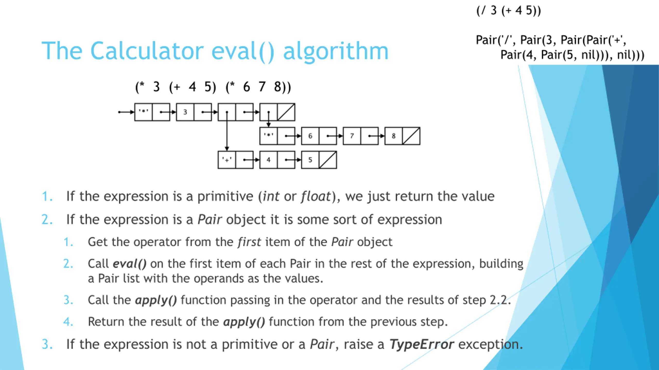(/ 3 (+ 4 5)) Pair('/', Pair(3, Pair(Pair('+', Pair(4, Pair(5, nil))), nil))) The Calculator eval() algorithm (* 3 (+ 4 5) (* 6 7 8)) 1. If the expression is a primitive (int or float), we just return the value 2. If the expression is a Pair object it is some sort of expression 1. Get the operator from the first item of the Pair object 2. Call eval() on the first item of each Pair in the rest of the expression, building a Pair list with the operands as the values. 3. Call the apply() function passing in the operator and the results of step 2.2. 4. Return the result of the apply() function from the previous step. 3. If the expression is not a primitive or a Pair, raise a TypeError exception.