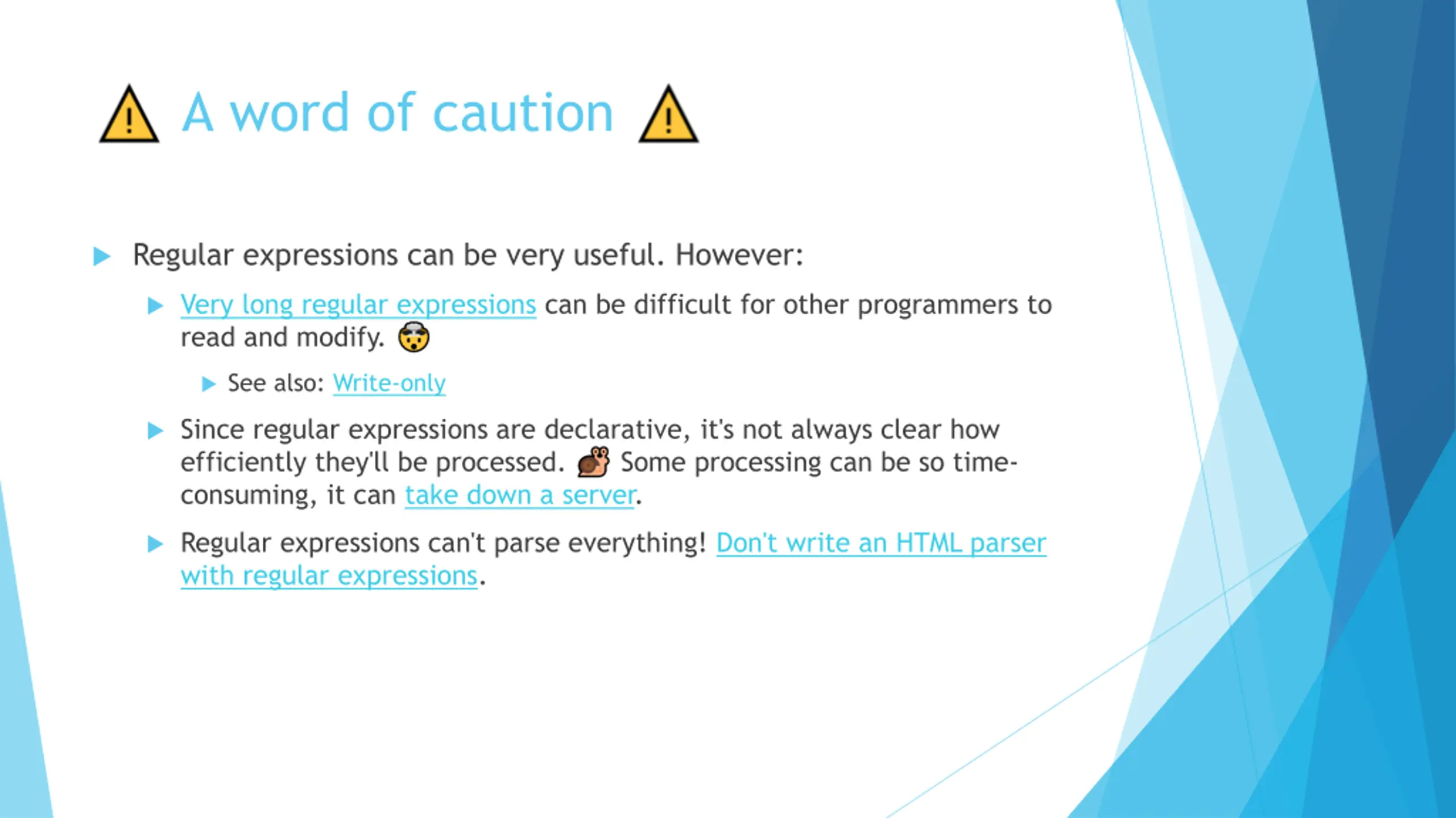 A word of caution Regular expressions can be very useful. However: Very long regular expressions can be difficult for other programmers to read and modify. See also: Write-only Since regular expressions are declarative, it's not always clear how efficiently they'll be processed. consuming, it can take down a server. Some processing can be so time- Regular expressions can't parse everything! Don't write an HTML parser with regular expressions.