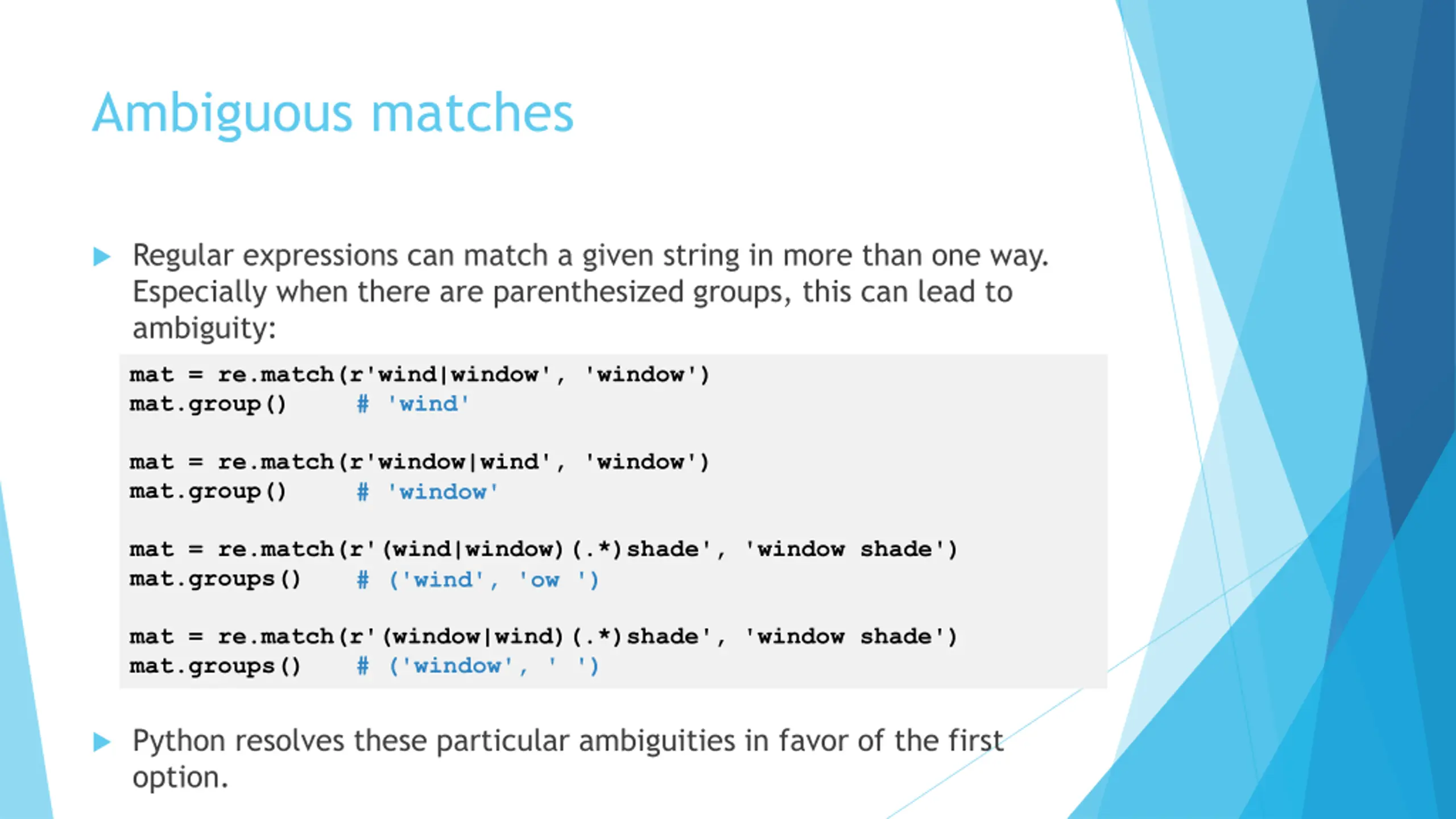 Ambiguous matches Regular expressions can match a given string in more than one way. Especially when there are parenthesized groups, this can lead to ambiguity: mat = re.match(r'wind|window', 'window') mat.group() # 'wind' mat = re.match(r'window|wind', 'window') mat.group() # 'window' mat = re.match(r'(wind|window)(.*)shade', 'window shade') mat.groups() # ('wind', 'ow ') mat = re.match(r'(window|wind)(.*)shade', 'window shade') mat.groups() # ('window', ' ') Python resolves these particular ambiguities in favor of the first option.
