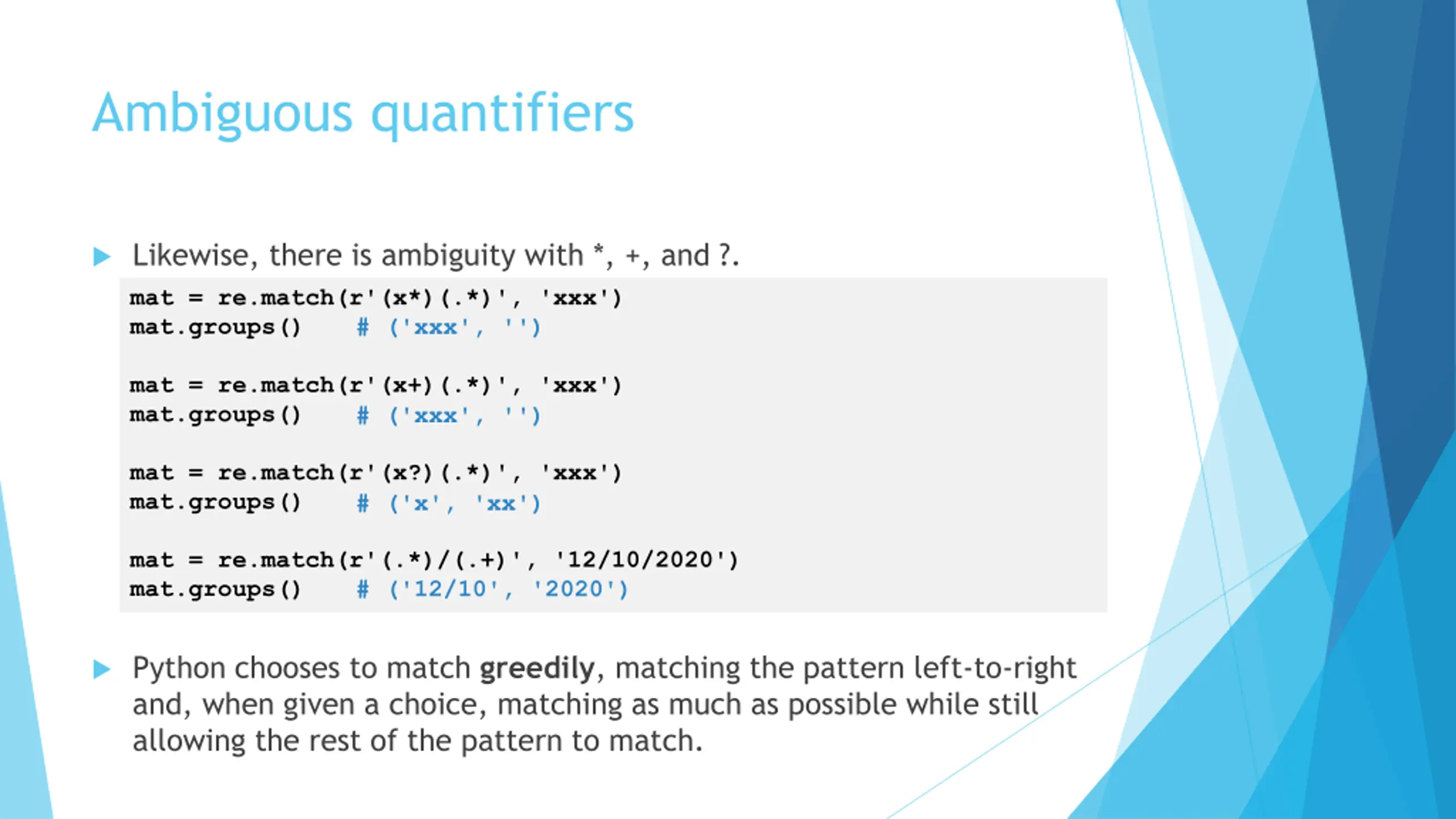 Ambiguous quantifiers Likewise, there is ambiguity with *, +, and ?. mat = re.match(r'(x*)(.*)', 'xxx') mat.groups() # ('xxx', '') mat = re.match(r'(x+)(.*)', 'xxx') mat.groups() # ('xxx', '') mat = re.match(r'(x?)(.*)', 'xxx') mat.groups() # ('x', 'xx') mat = re.match(r'(.*)/(.+)', '12/10/2020') mat.groups() # ('12/10', '2020') Python chooses to match greedily, matching the pattern left-to-right and, when given a choice, matching as much as possible while still allowing the rest of the pattern to match.