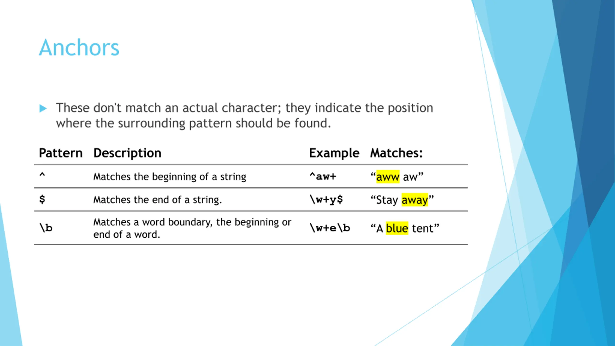 Anchors These don't match an actual character; they indicate the position where the surrounding pattern should be found. Pattern Description Example Matches: aww aw ^ ^aw+ Matches the beginning of a string Stay away $ \w+y$ Matches the end of a string. Matches a word boundary, the beginning or end of a word. A blue tent \b \w+e\b