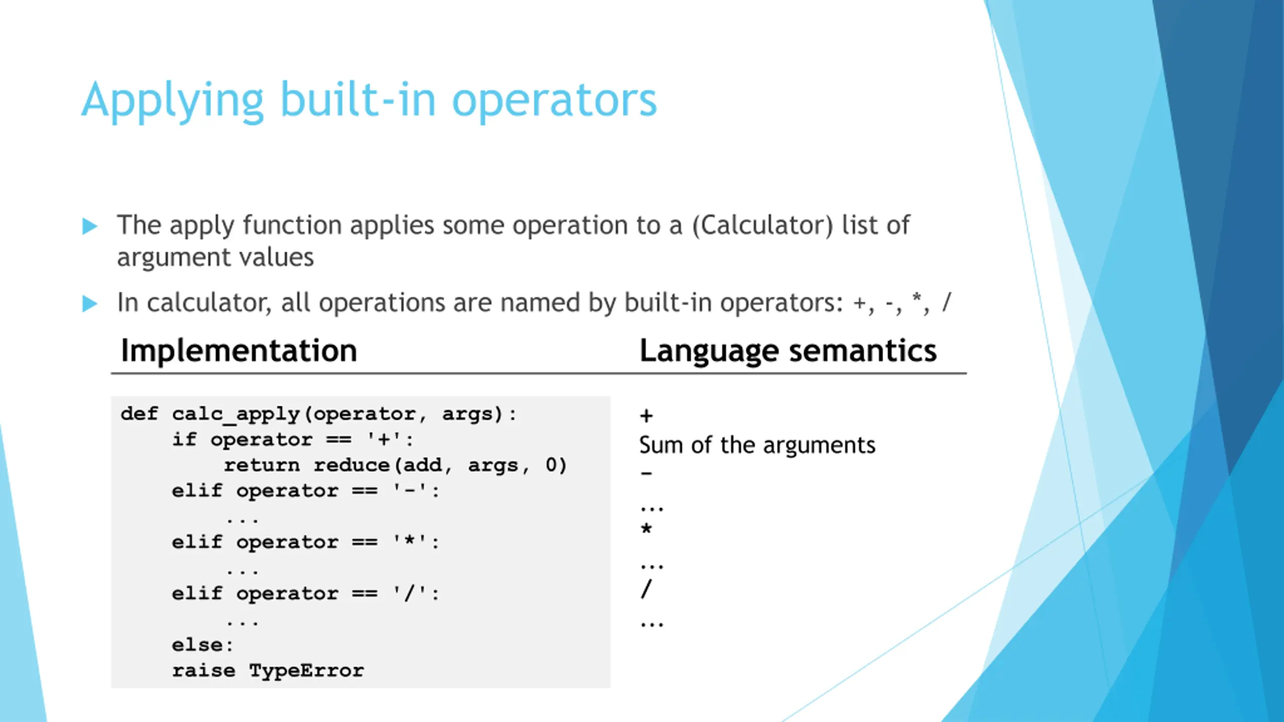 Applying built-in operators The apply function applies some operation to a (Calculator) list of argument values In calculator, all operations are named by built-in operators: +, -, *, / Implementation Language semantics def calc_apply(operator, args): if operator == '+': return reduce(add, args, 0) elif operator == '-': ... elif operator == '*': ... elif operator == '/': ... else: raise TypeError + Sum of the arguments - ... * ... / ...
