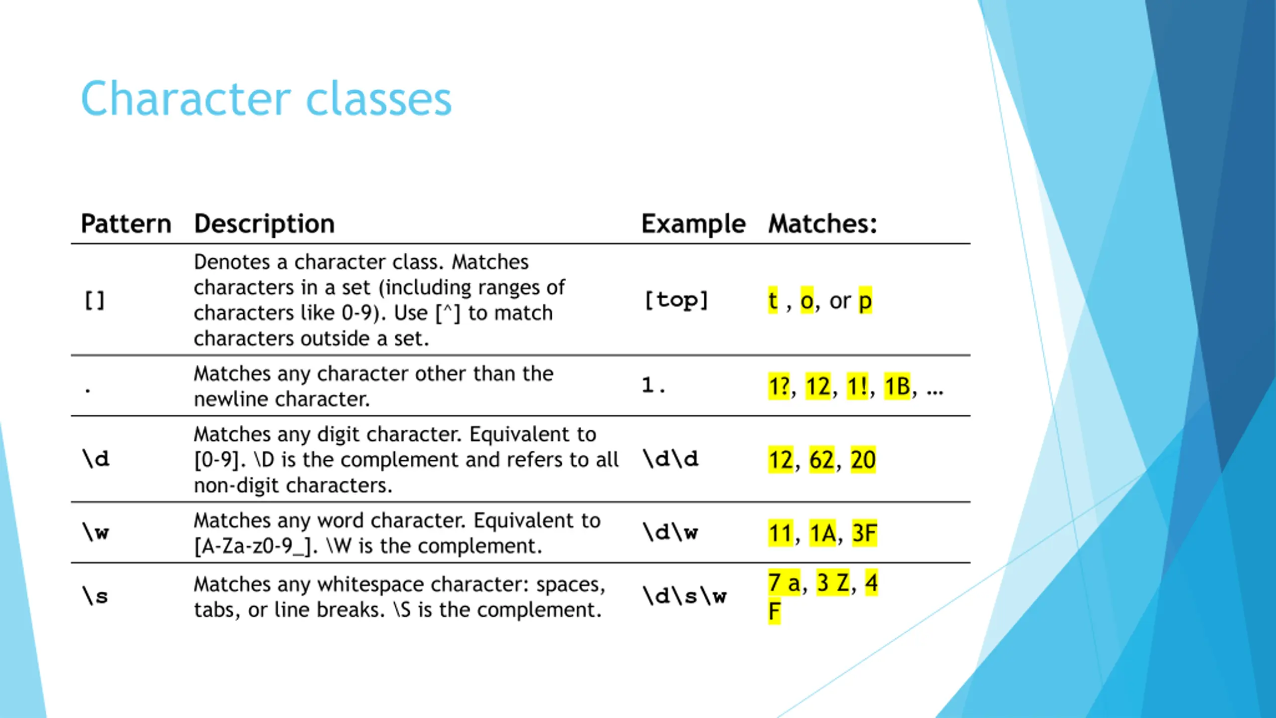 Character classes Pattern Description Denotes a character class. Matches characters in a set (including ranges of characters like 0-9). Use [^] to match characters outside a set. Matches any character other than the newline character. Matches any digit character. Equivalent to [0-9]. \D is the complement and refers to all non-digit characters. Matches any word character. Equivalent to [A-Za-z0-9_]. \W is the complement. Example Matches: t , o, or p [] [top] 1?, 12, 1!, 1B, . 1. 12, 62, 20 \d \d\d 11, 1A, 3F \w \d\w 7 a, 3 Z, 4 F Matches any whitespace character: spaces, tabs, or line breaks. \S is the complement. \s \d\s\w