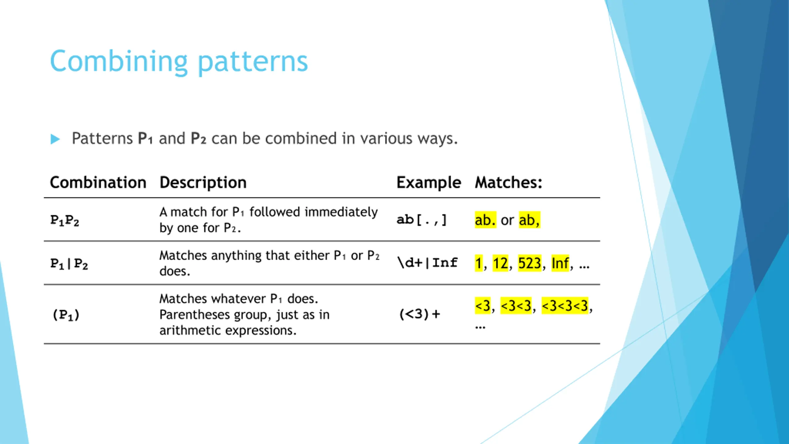 Combining patterns Patterns P and P can be combined in various ways. Combination Description Example Matches: A match for P followed immediately by one for P . ab. or ab, ab[.,] P P Matches anything that either P or P does. 1, 12, 523, Inf, \d+|Inf P |P Matches whatever P does. Parentheses group, just as in arithmetic expressions. <3, <3<3, <3<3<3, (<3)+ (P )