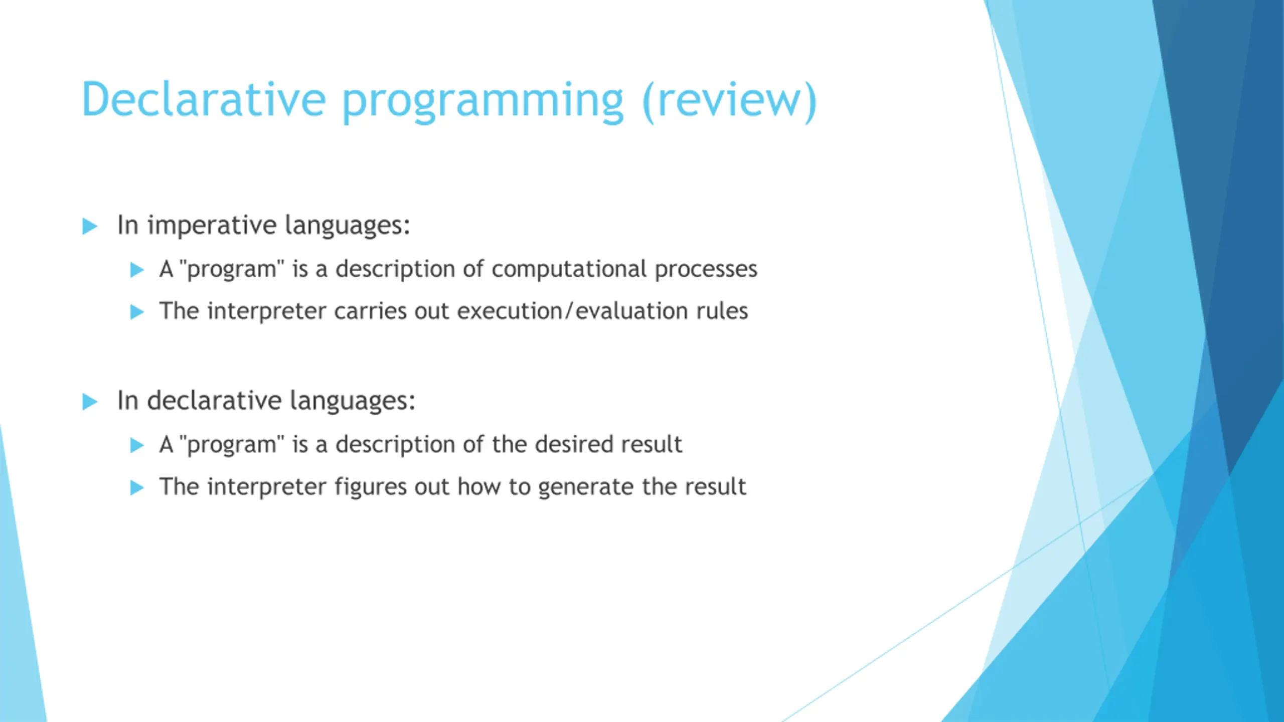 Declarative programming (review) In imperative languages: A "program" is a description of computational processes The interpreter carries out execution/evaluation rules In declarative languages: A "program" is a description of the desired result The interpreter figures out how to generate the result