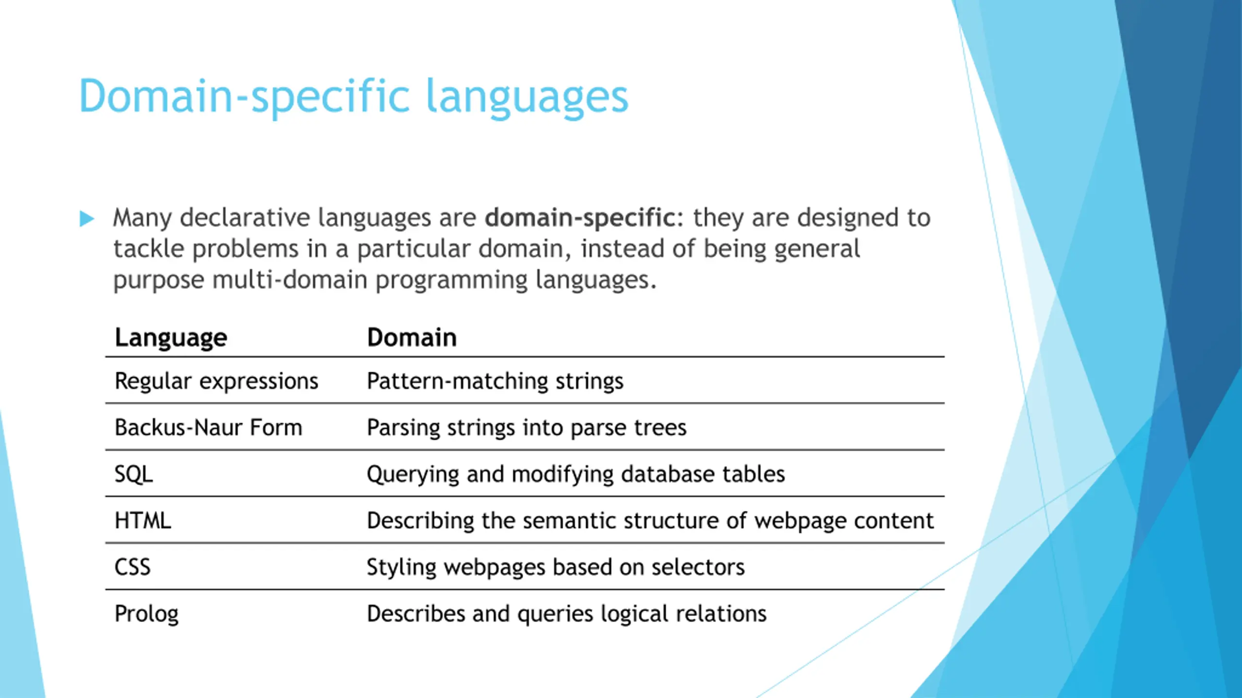 Domain-specific languages Many declarative languages are domain-specific: they are designed to tackle problems in a particular domain, instead of being general purpose multi-domain programming languages. Language Domain Regular expressions Pattern-matching strings Backus-Naur Form Parsing strings into parse trees SQL Querying and modifying database tables HTML Describing the semantic structure of webpage content CSS Styling webpages based on selectors Prolog Describes and queries logical relations