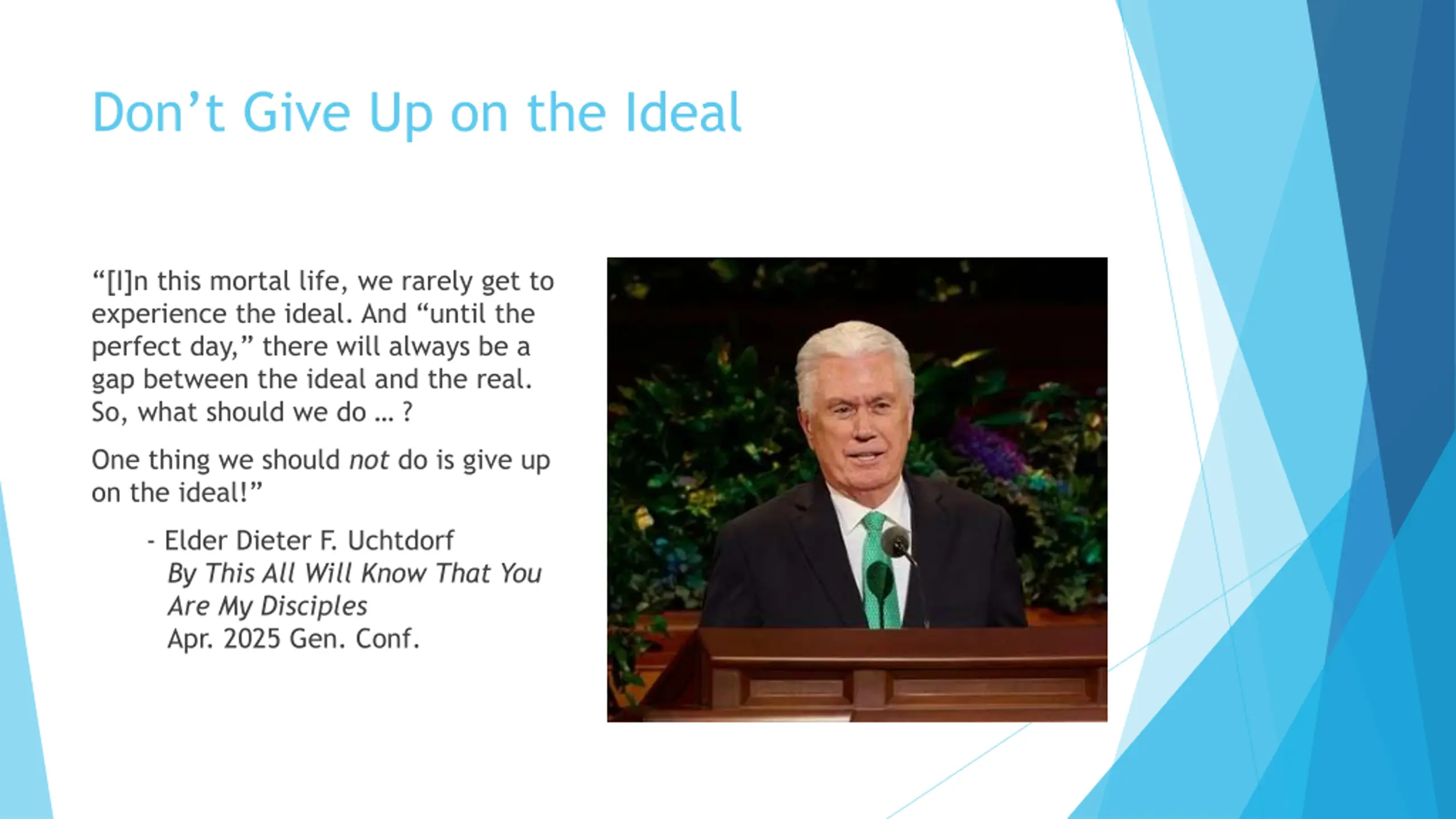 Dont Give Up on the Ideal [I]n this mortal life, we rarely get to experience the ideal. And until the perfect day, there will always be a gap between the ideal and the real. So, what should we do ? One thing we should not do is give up on the ideal! - Elder Dieter F. Uchtdorf By This All Will Know That You Are My Disciples Apr. 2025 Gen. Conf.