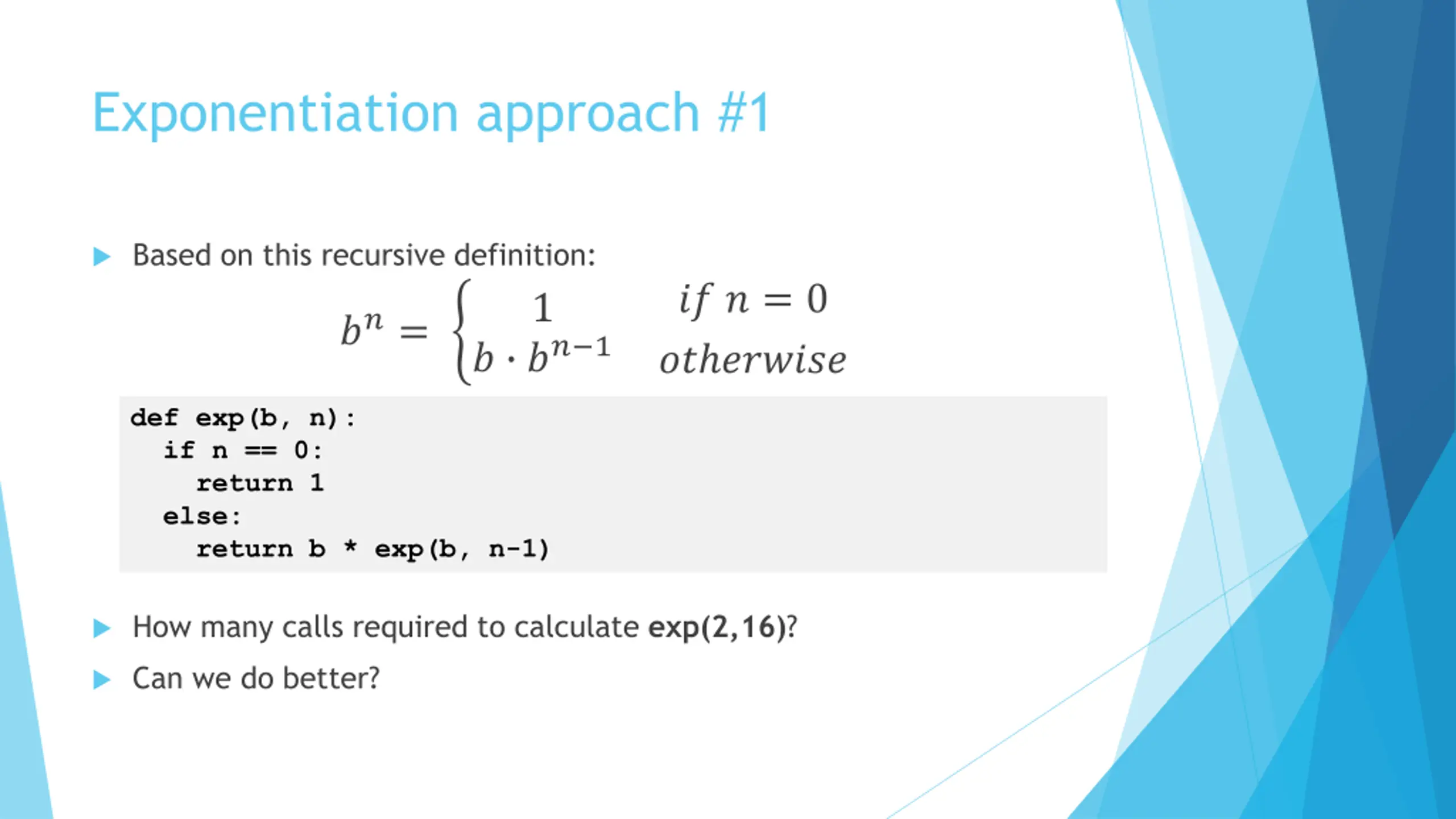 Exponentiation approach #1 Based on this recursive definition: ?? ? = 0 ?? ?????? 1 ??= ? ?? 1 def exp(b, n): if n == 0: return 1 else: return b * exp(b, n-1) How many calls required to calculate exp(2,16)? Can we do better?