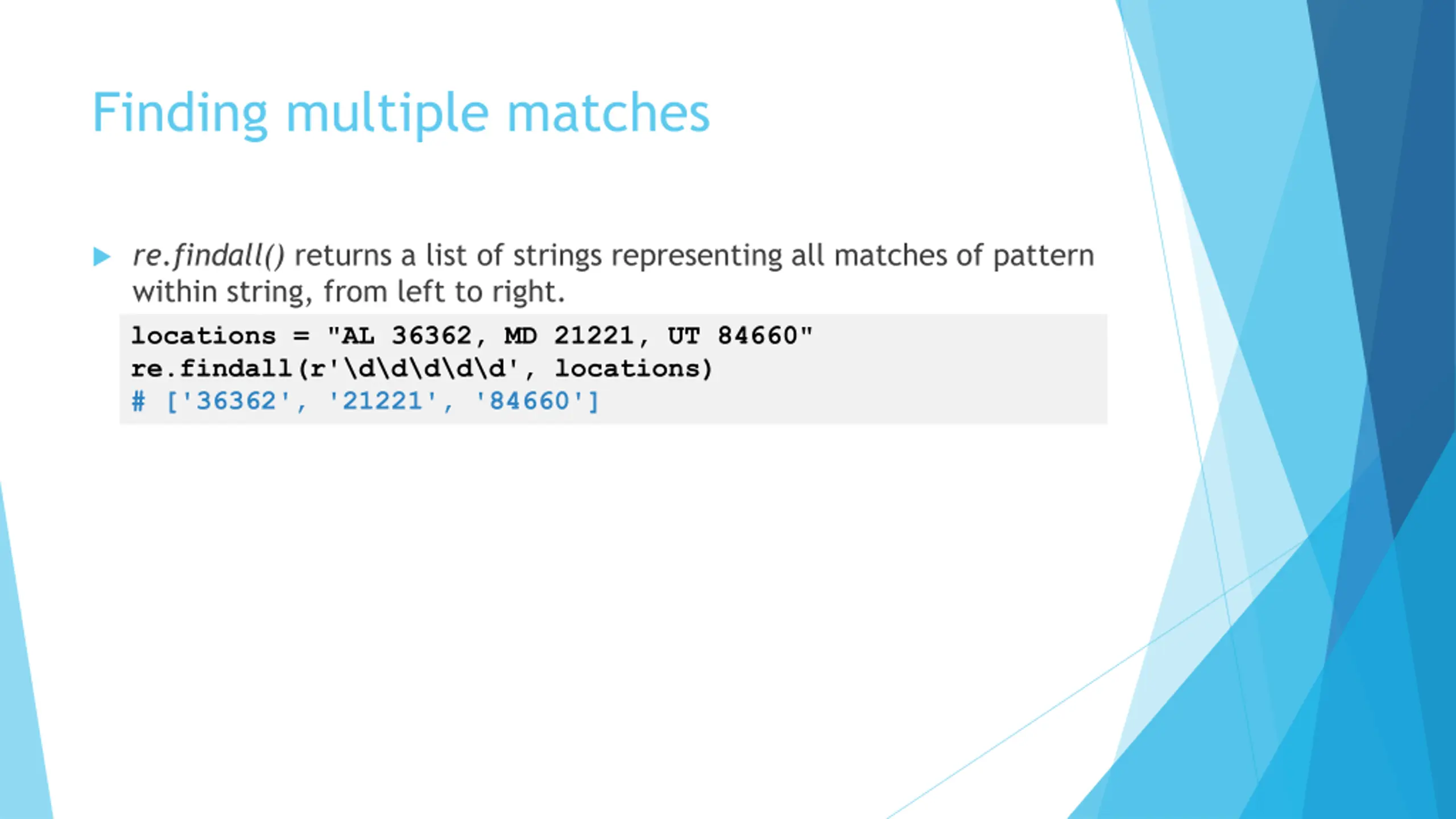 Finding multiple matches re.findall() returns a list of strings representing all matches of pattern within string, from left to right. locations = "AL 36362, MD 21221, UT 84660" re.findall(r'\d\d\d\d\d', locations) # ['36362', '21221', '84660']