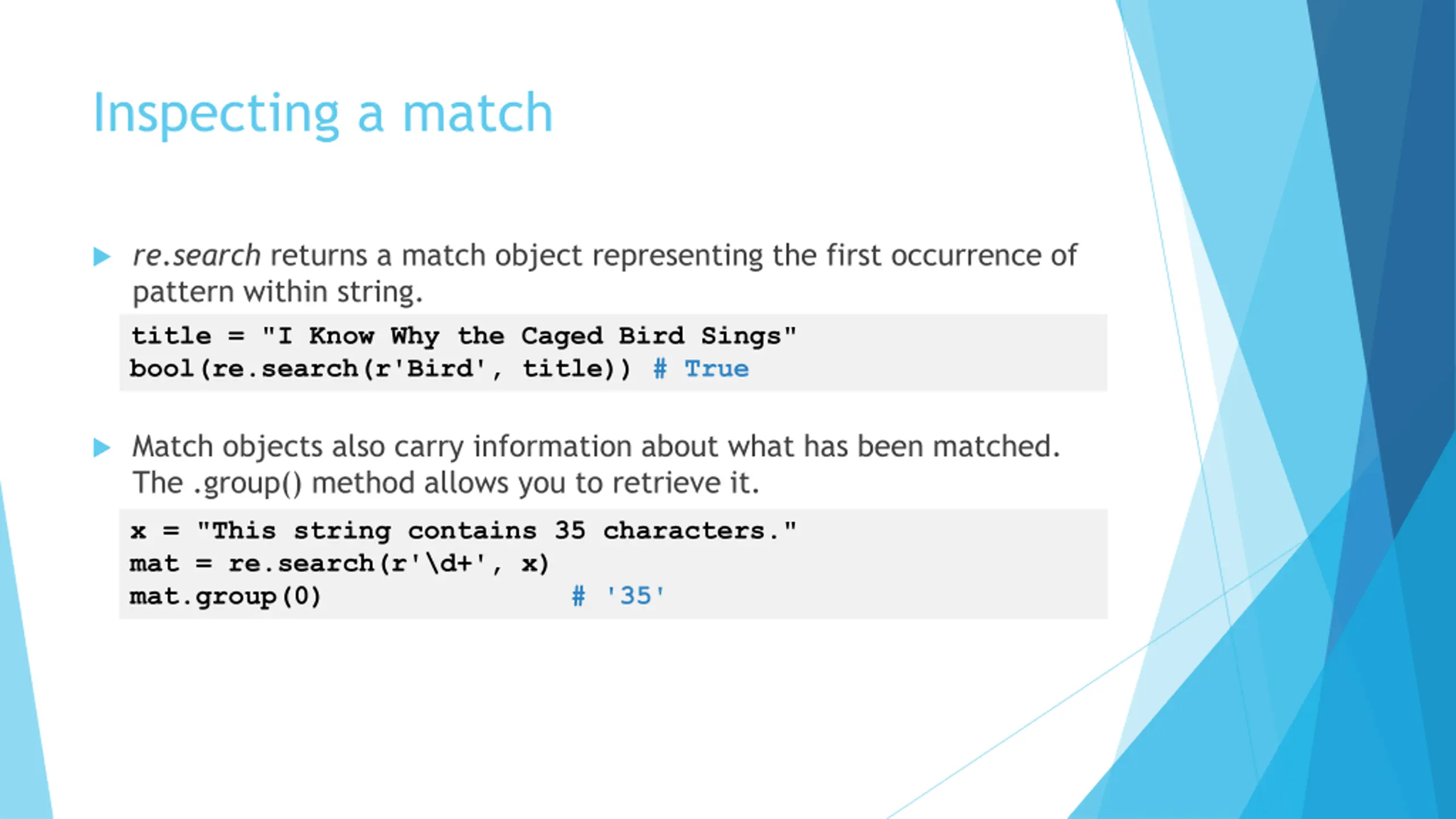 Inspecting a match re.search returns a match object representing the first occurrence of pattern within string. title = "I Know Why the Caged Bird Sings" bool(re.search(r'Bird', title)) # True Match objects also carry information about what has been matched. The .group() method allows you to retrieve it. x = "This string contains 35 characters." mat = re.search(r'\d+', x) mat.group(0) # '35'