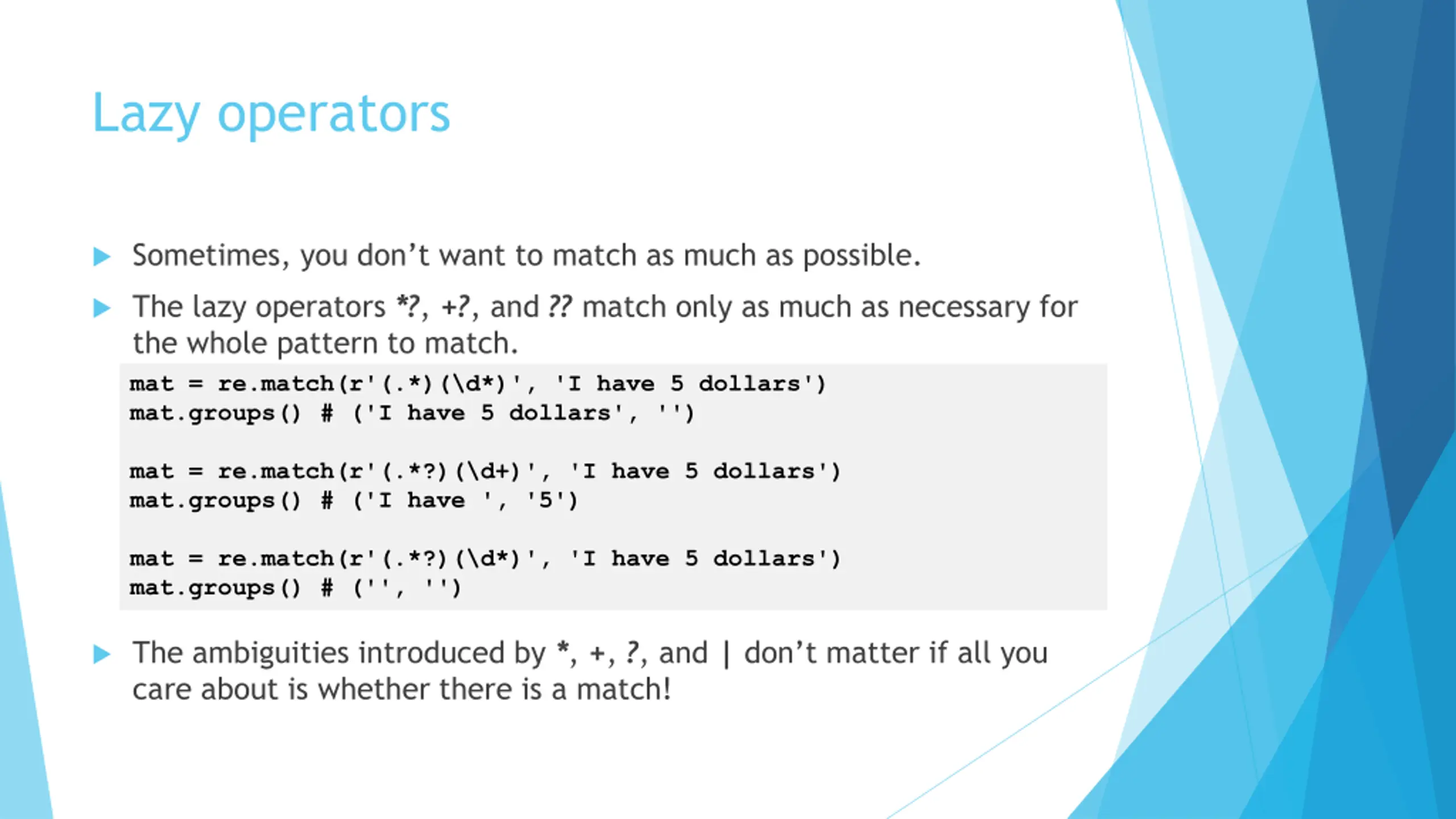 Lazy operators Sometimes, you don t want to match as much as possible. The lazy operators *?, +?, and ?? match only as much as necessary for the whole pattern to match. mat = re.match(r'(.*)(\d*)', 'I have 5 dollars') mat.groups() # ('I have 5 dollars', '') mat = re.match(r'(.*?)(\d+)', 'I have 5 dollars') mat.groups() # ('I have ', '5') mat = re.match(r'(.*?)(\d*)', 'I have 5 dollars') mat.groups() # ('', '') The ambiguities introduced by *, +, ?, and |don t matter if all you care about is whether there is a match!