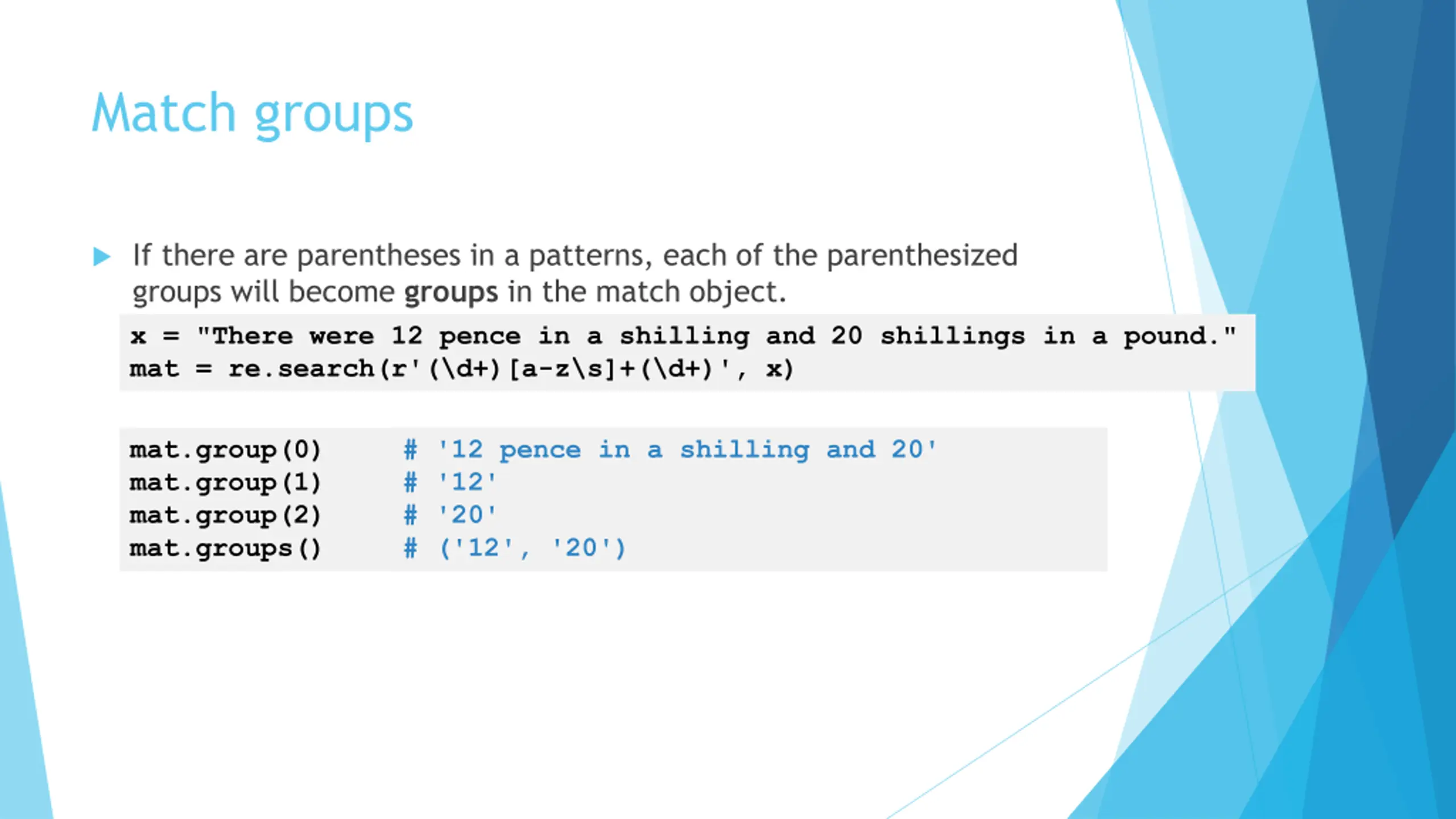 Match groups If there are parentheses in a patterns, each of the parenthesized groups will become groups in the match object. x = "There were 12 pence in a shilling and 20 shillings in a pound." mat = re.search(r'(\d+)[a-z\s]+(\d+)', x) mat.group(0) mat.group(1) mat.group(2) mat.groups() # '12 pence in a shilling and 20' # '12' # '20' # ('12', '20')