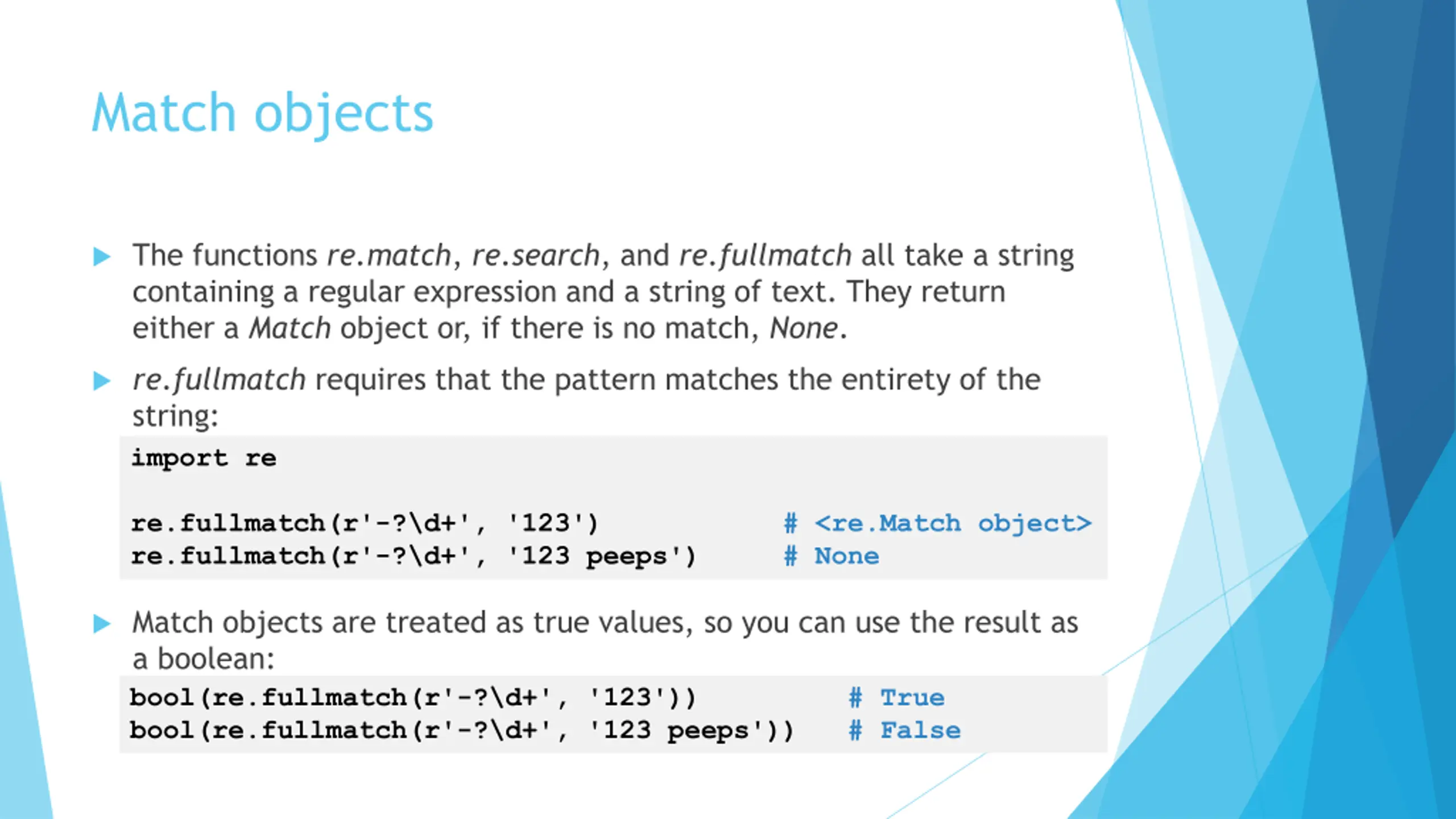 Match objects The functions re.match, re.search, and re.fullmatch all take a string containing a regular expression and a string of text. They return either a Match object or, if there is no match, None. re.fullmatch requires that the pattern matches the entirety of the string: import re re.fullmatch(r'-?\d+', '123') # <re.Match object> re.fullmatch(r'-?\d+', '123 peeps') # None Match objects are treated as true values, so you can use the result as a boolean: bool(re.fullmatch(r'-?\d+', '123')) # True bool(re.fullmatch(r'-?\d+', '123 peeps')) # False