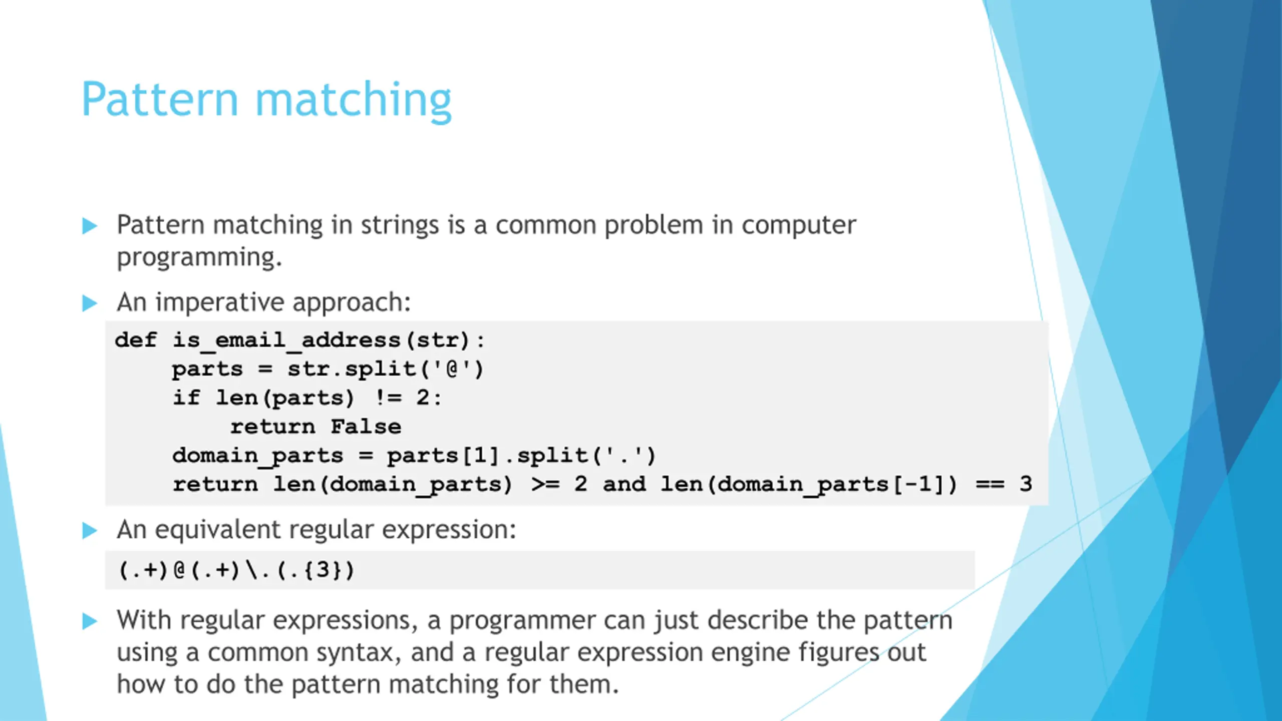 Pattern matching Pattern matching in strings is a common problem in computer programming. An imperative approach: def is_email_address(str): parts = str.split('@') if len(parts) != 2: return False domain_parts = parts[1].split('.') return len(domain_parts) >= 2 and len(domain_parts[-1]) == 3 An equivalent regular expression: (.+)@(.+)\.(.{3}) With regular expressions, a programmer can just describe the pattern using a common syntax, and a regular expression engine figures out how to do the pattern matching for them.