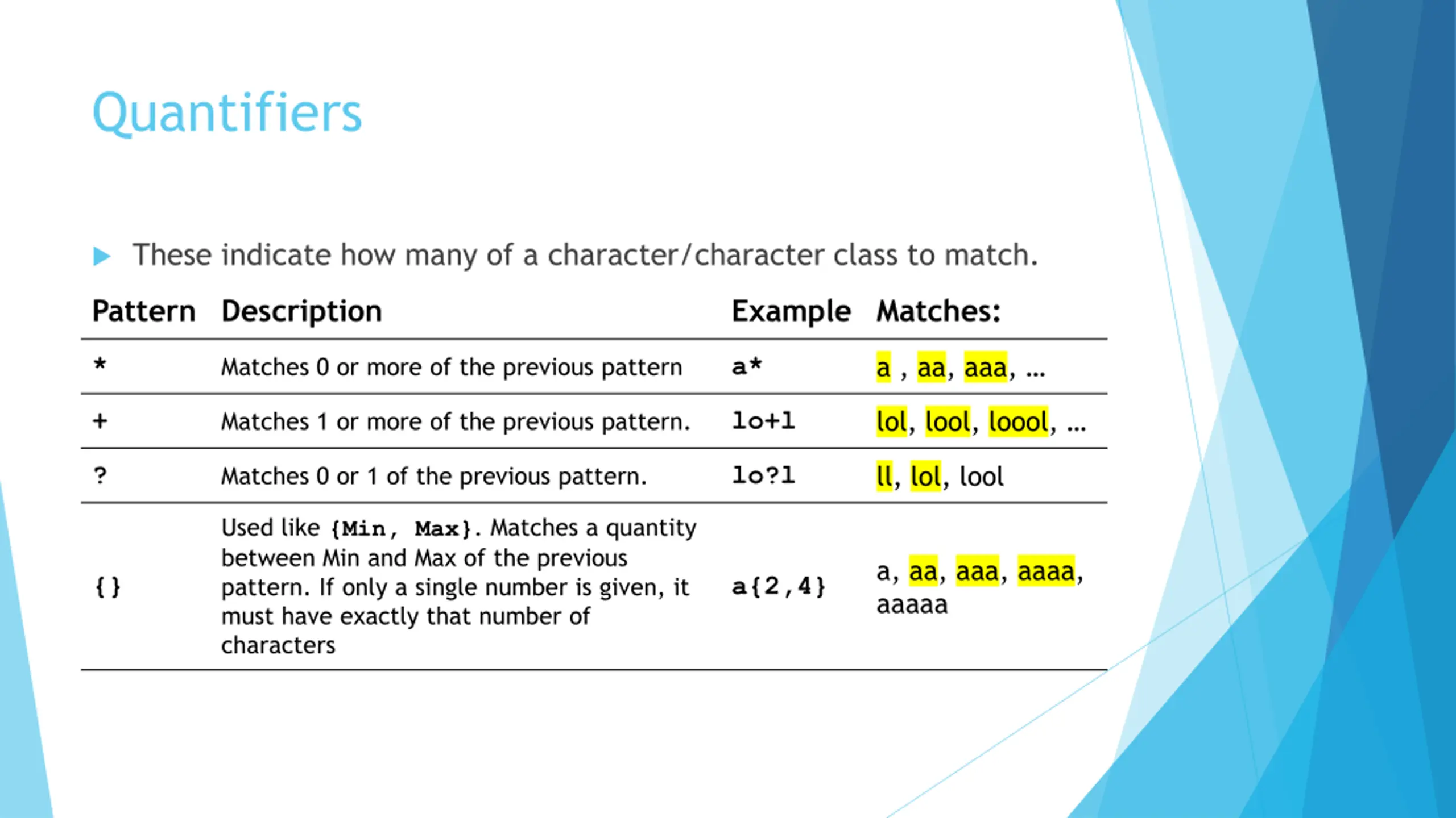 Quantifiers These indicate how many of a character/character class to match. Pattern Description Example Matches: a , aa, aaa, * a* Matches 0 or more of the previous pattern lol, lool, loool, + lo+l Matches 1 or more of the previous pattern. ll, lol, lool ? lo?l Matches 0 or 1 of the previous pattern. Used like {Min, Max}. Matches a quantity between Min and Max of the previous pattern. If only a single number is given, it must have exactly that number of characters a, aa, aaa, aaaa, aaaaa {} a{2,4}