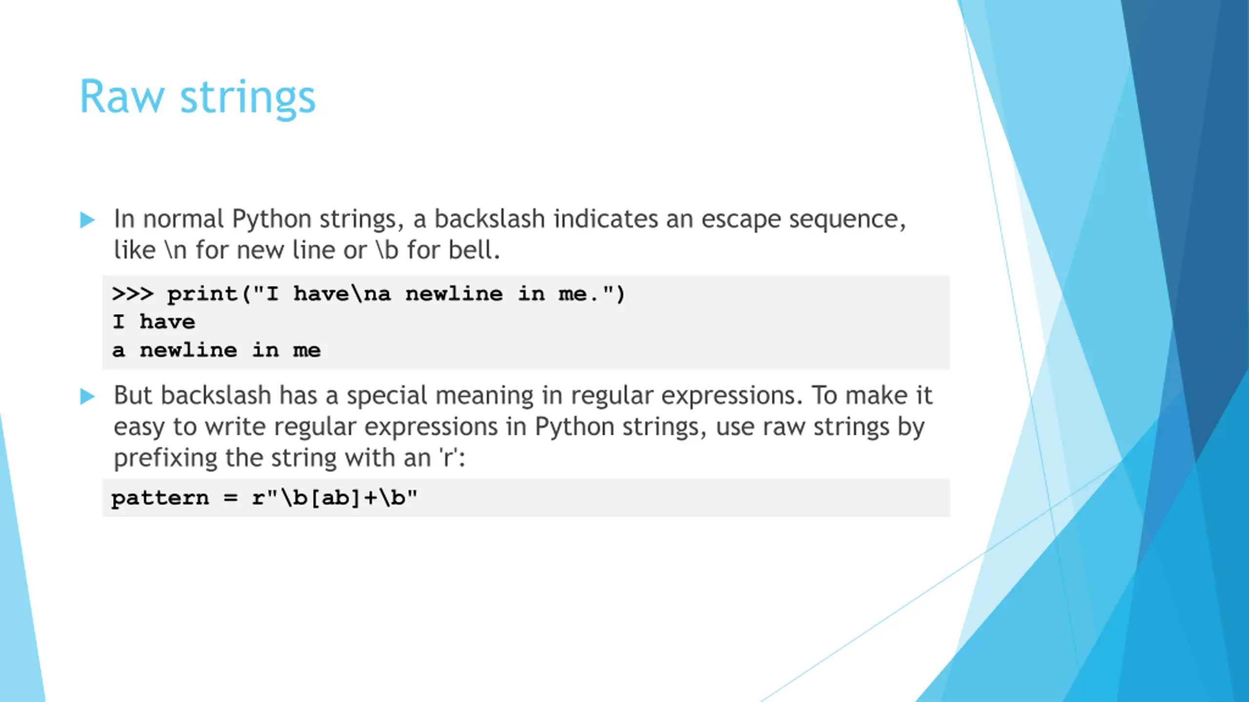 Raw strings In normal Python strings, a backslash indicates an escape sequence, like \n for new line or \b for bell. >>> print("I have\na newline in me.") I have a newline in me But backslash has a special meaning in regular expressions. To make it easy to write regular expressions in Python strings, use raw strings by prefixing the string with an 'r': pattern = r"\b[ab]+\b"