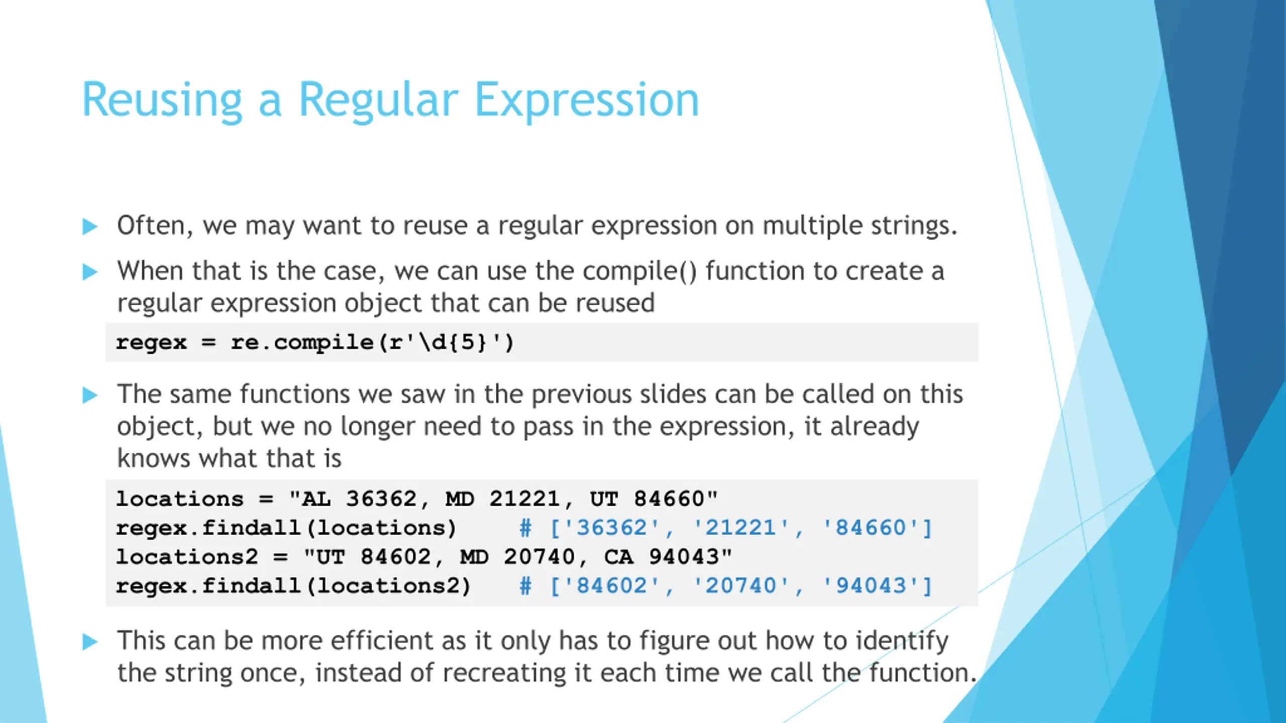 Reusing a Regular Expression Often, we may want to reuse a regular expression on multiple strings. When that is the case, we can use the compile() function to create a regular expression object that can be reused regex = re.compile(r'\d{5}') The same functions we saw in the previous slides can be called on this object, but we no longer need to pass in the expression, it already knows what that is locations = "AL 36362, MD 21221, UT 84660" regex.findall(locations) # ['36362', '21221', '84660'] locations2 = "UT 84602, MD 20740, CA 94043" regex.findall(locations2) # ['84602', '20740', '94043'] This can be more efficient as it only has to figure out how to identify the string once, instead of recreating it each time we call the function.