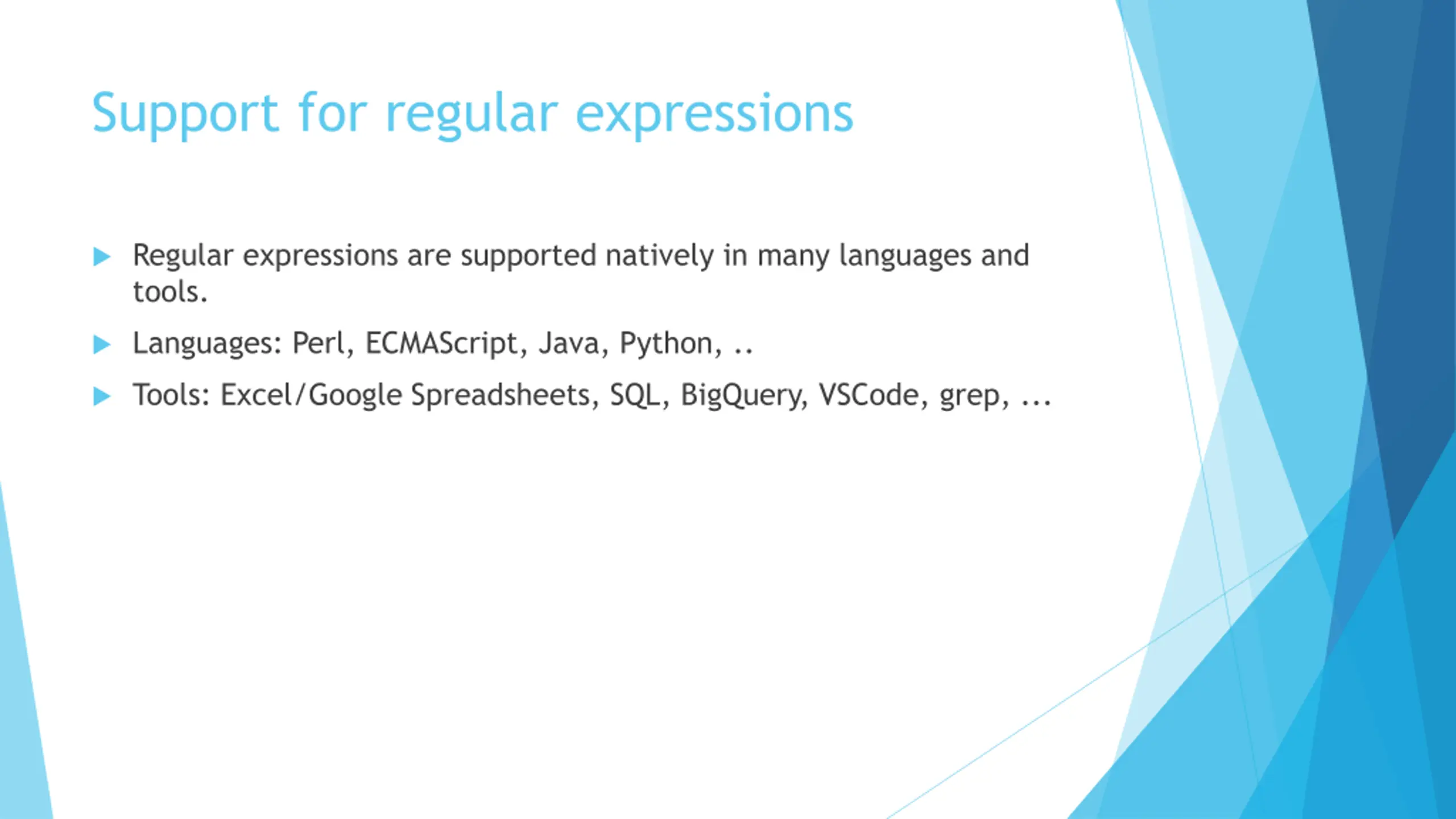 Support for regular expressions Regular expressions are supported natively in many languages and tools. Languages: Perl, ECMAScript, Java, Python, .. Tools: Excel/Google Spreadsheets, SQL, BigQuery, VSCode, grep, ...