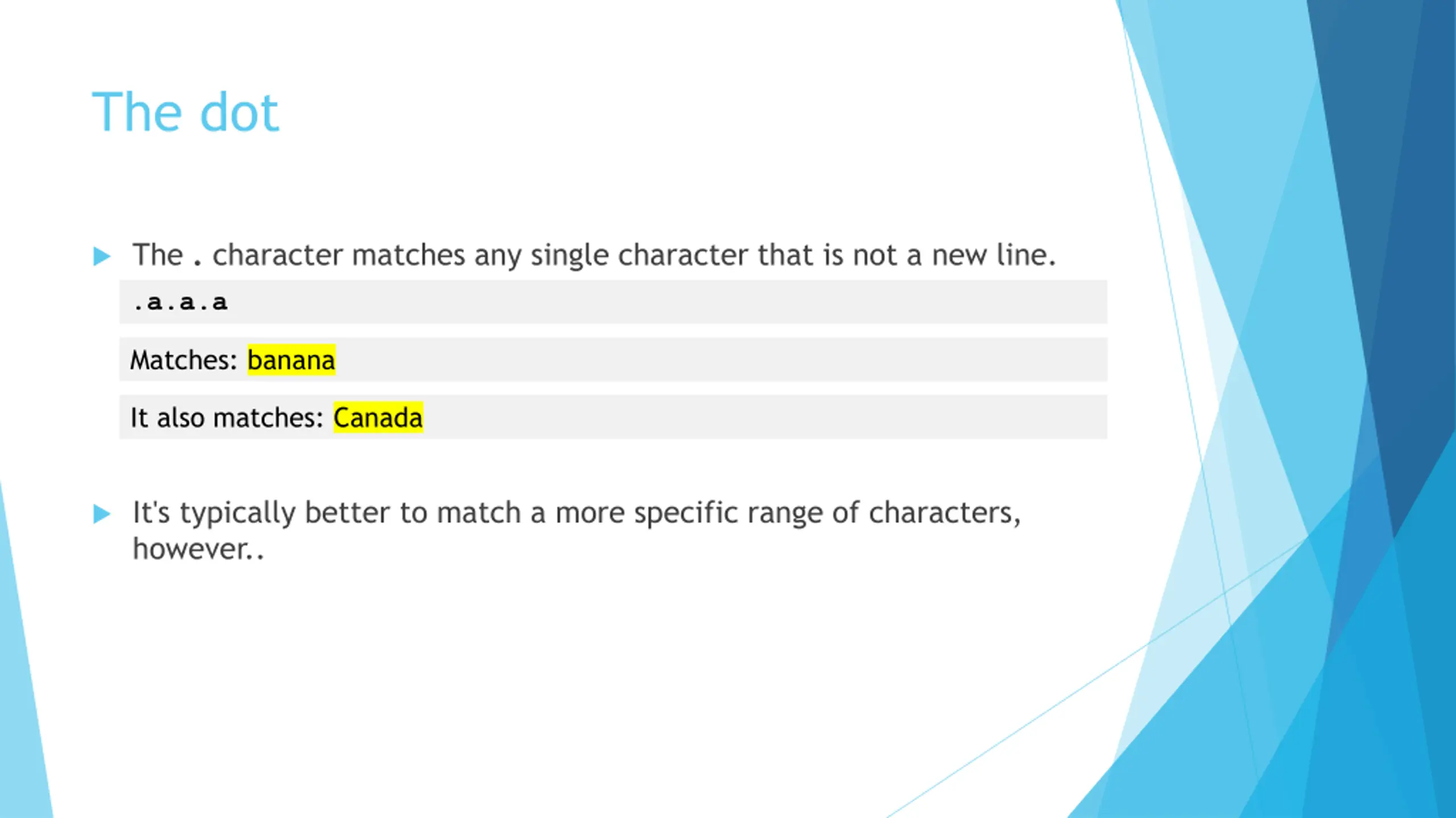 The dot The . character matches any single character that is not a new line. .a.a.a Matches: banana It also matches: Canada It's typically better to match a more specific range of characters, however..