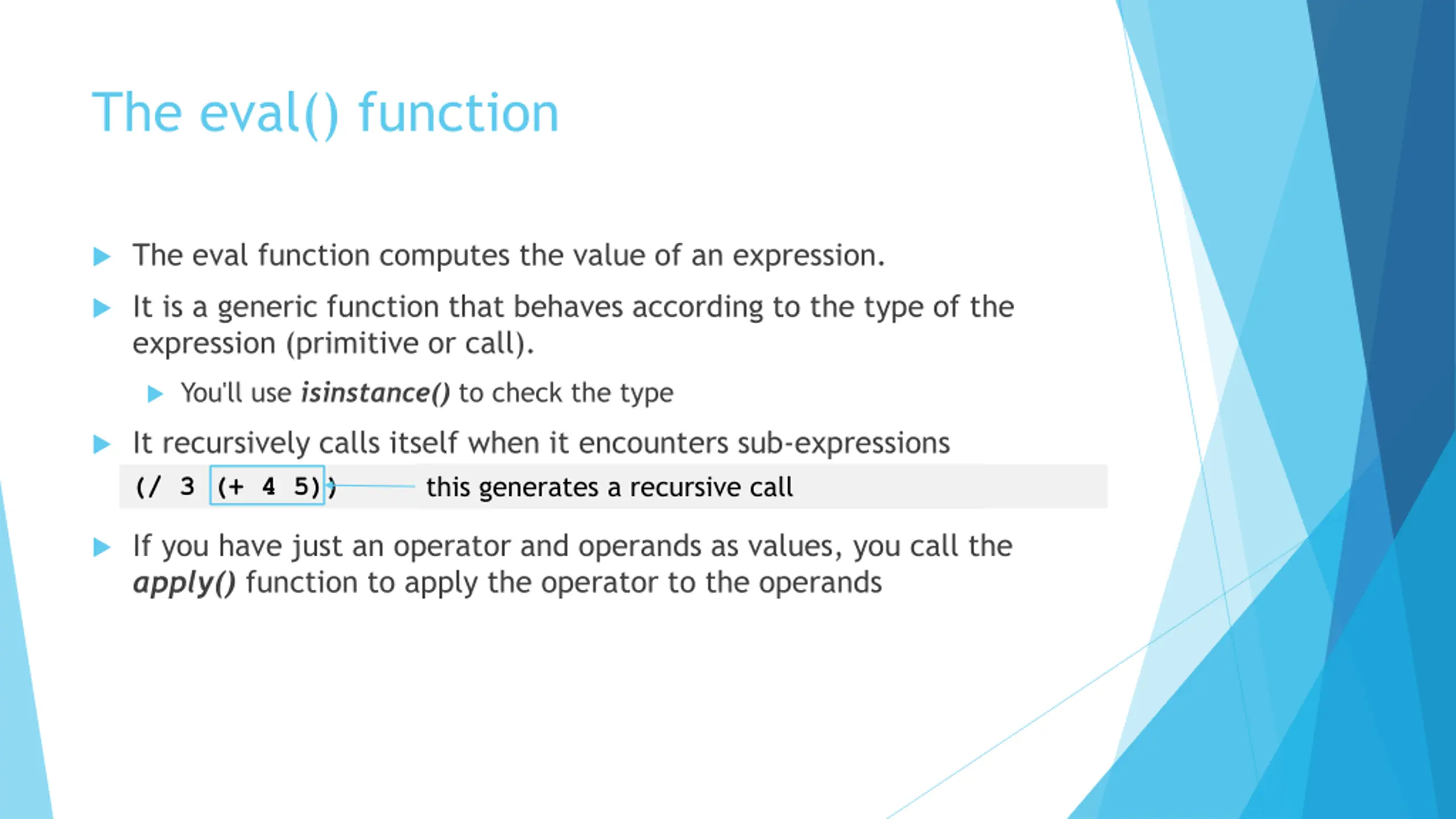 The eval() function The eval function computes the value of an expression. It is a generic function that behaves according to the type of the expression (primitive or call). You'll use isinstance() to check the type It recursively calls itself when it encounters sub-expressions (/ 3 (+ 4 5)) this generates a recursive call If you have just an operator and operands as values, you call the apply() function to apply the operator to the operands