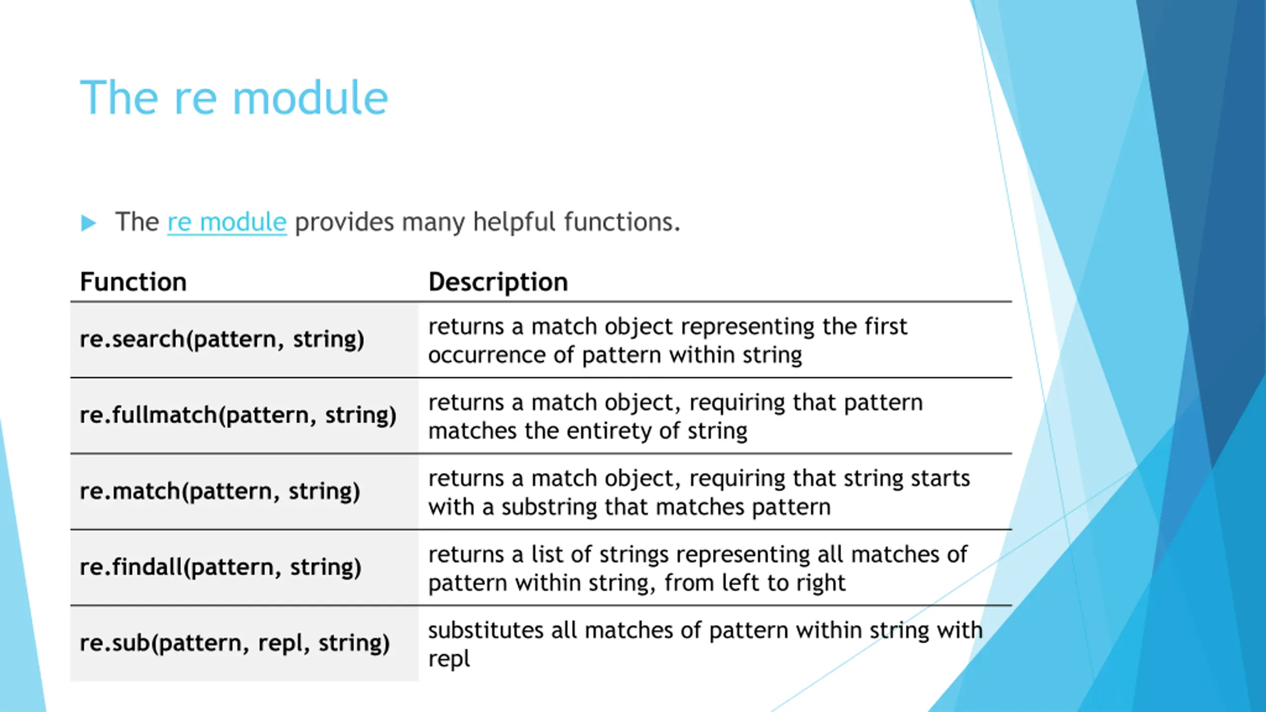 The re module The re module provides many helpful functions. Function Description returns a match object representing the first occurrence of pattern within string re.search(pattern, string) returns a match object, requiring that pattern matches the entirety of string re.fullmatch(pattern, string) returns a match object, requiring that string starts with a substring that matches pattern re.match(pattern, string) returns a list of strings representing all matches of pattern within string, from left to right re.findall(pattern, string) substitutes all matches of pattern within string with repl re.sub(pattern, repl, string)