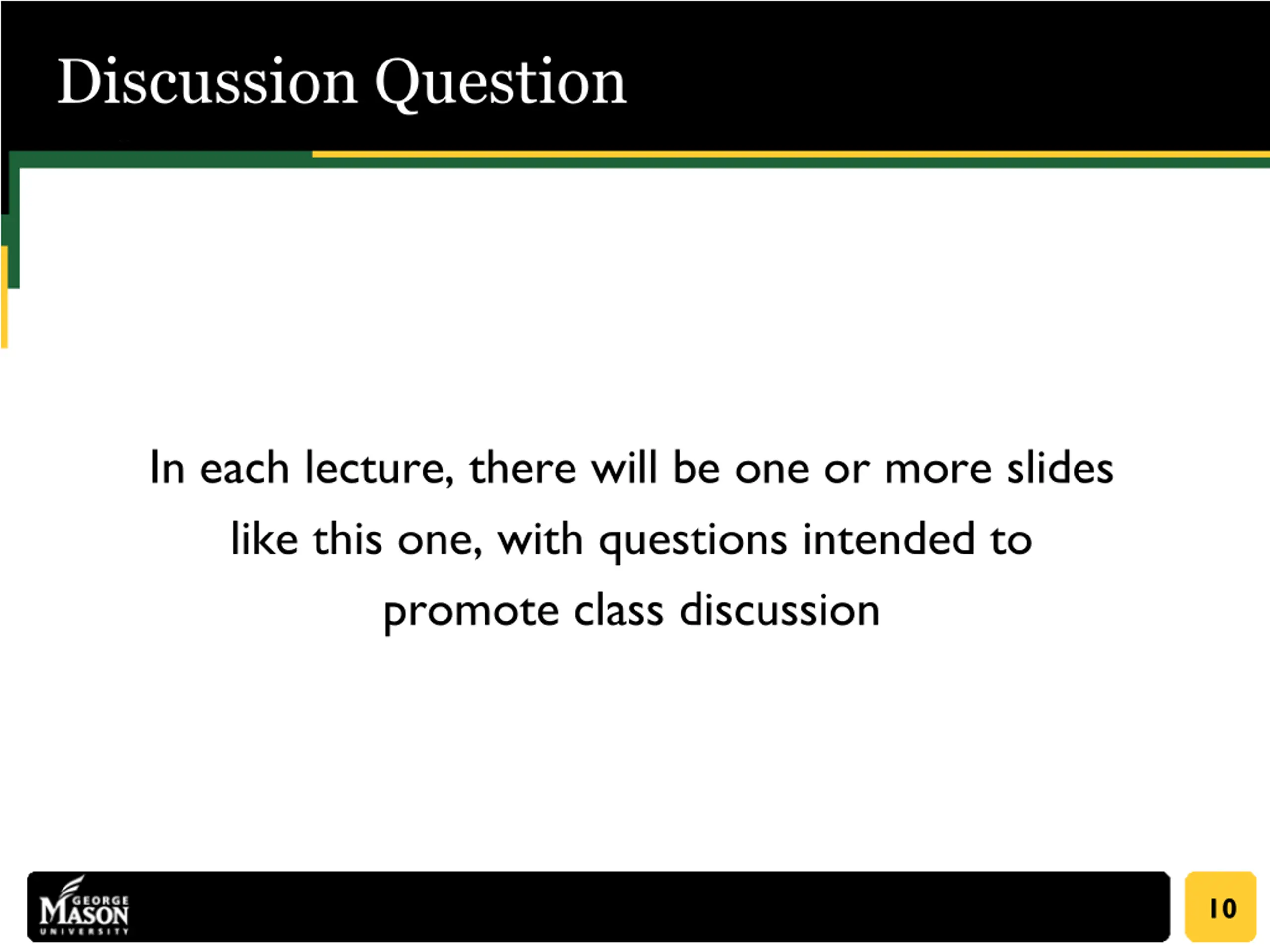 Discussion Question In each lecture, there will be one or more slides like this one, with questions intended to promote class discussion 10