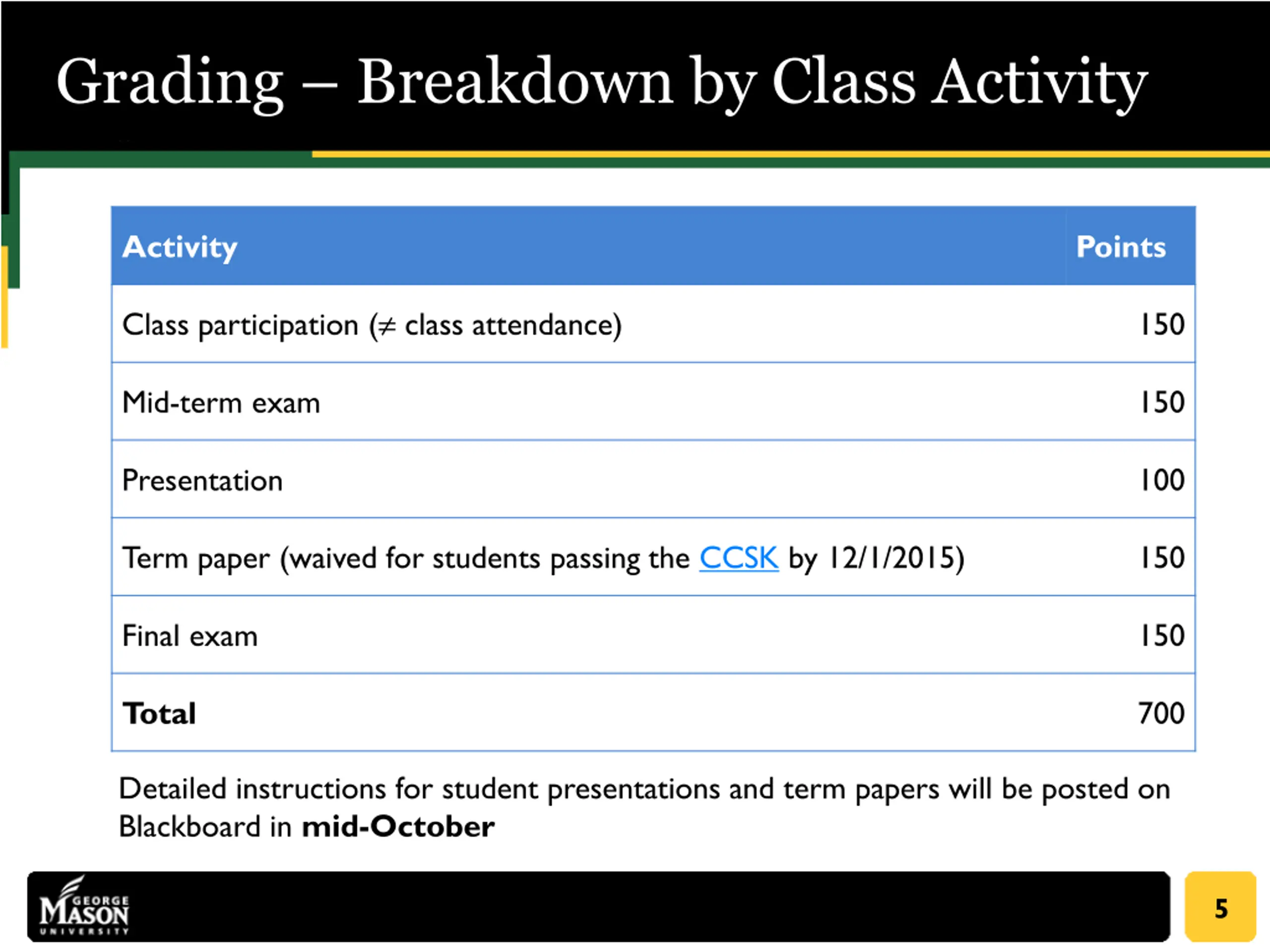 Grading Breakdown by Class Activity Activity Points Class participation ( class attendance) 150 Mid-term exam 150 Presentation 100 Term paper (waived for students passing the CCSK by 12/1/2015) 150 Final exam 150 Total 700 Detailed instructions for student presentations and term papers will be posted on Blackboard in mid-October 5