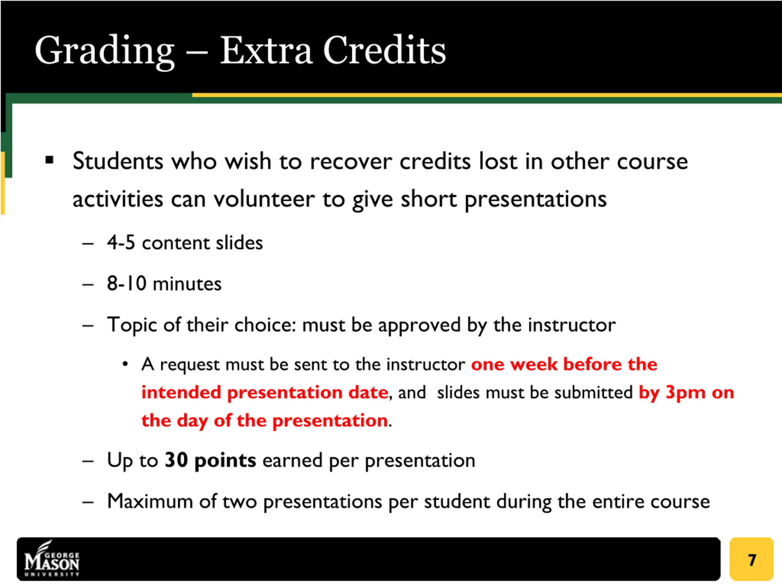 Grading Extra Credits Students who wish to recover credits lost in other course activities can volunteer to give short presentations 4-5 content slides 8-10 minutes Topic of their choice: must be approved by the instructor A request must be sent to the instructor one week before the intended presentation date, and slides must be submitted by 3pm on the day of the presentation. Up to 30 points earned per presentation Maximum of two presentations per student during the entire course 7
