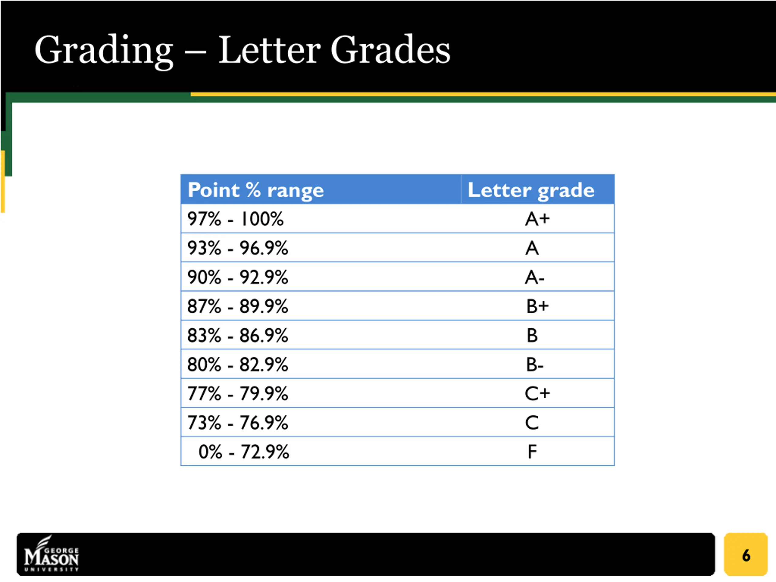Grading Letter Grades Point % range 97% - 100% 93% - 96.9% 90% - 92.9% 87% - 89.9% 83% - 86.9% 80% - 82.9% 77% - 79.9% 73% - 76.9% 0% - 72.9% Letter grade A+ A A- B+ B B- C+ C F 6